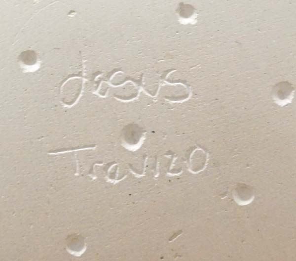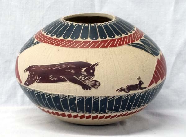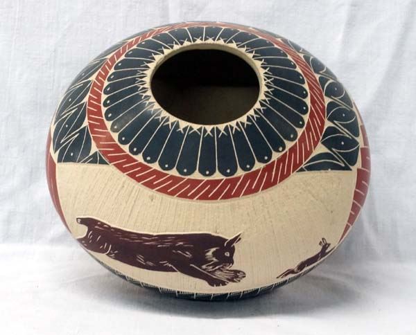 Mata Ortiz Sgraffito Polychrome Bobcat & Rabbit Jar by Jesus Trevizo, measures 4.5''H x 6.5''D, signed on bottom by artist, turkey tail feathers encirling rim, beautiful carving on this piece