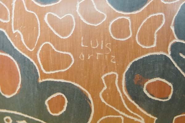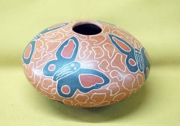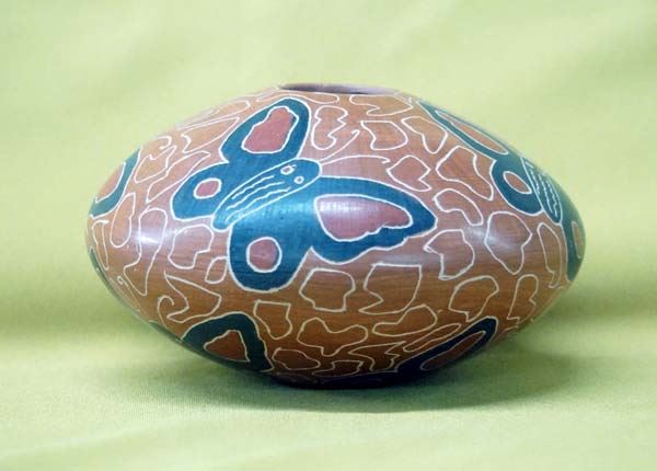 Mata Ortiz Polychrome Butterfly Seed Jar by Luis Ortiz, measures 6'' x 3.5''H, signed by artist, features sgraffito designs