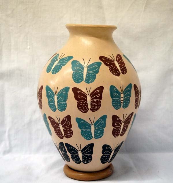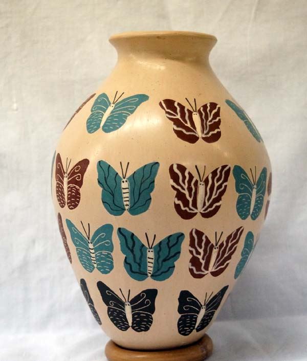 Mata Ortiz Polychrome Butterfly Jar by Toho Gaona, measures 8''H x 6''D, signed on bottom by artist, features teal, black, and brown butterflies all over this jar, flared rim, carved details on butterflies