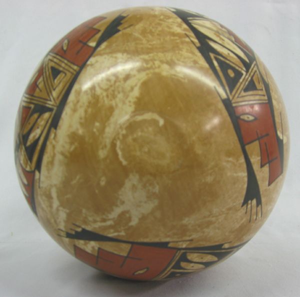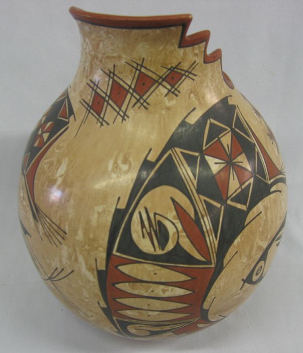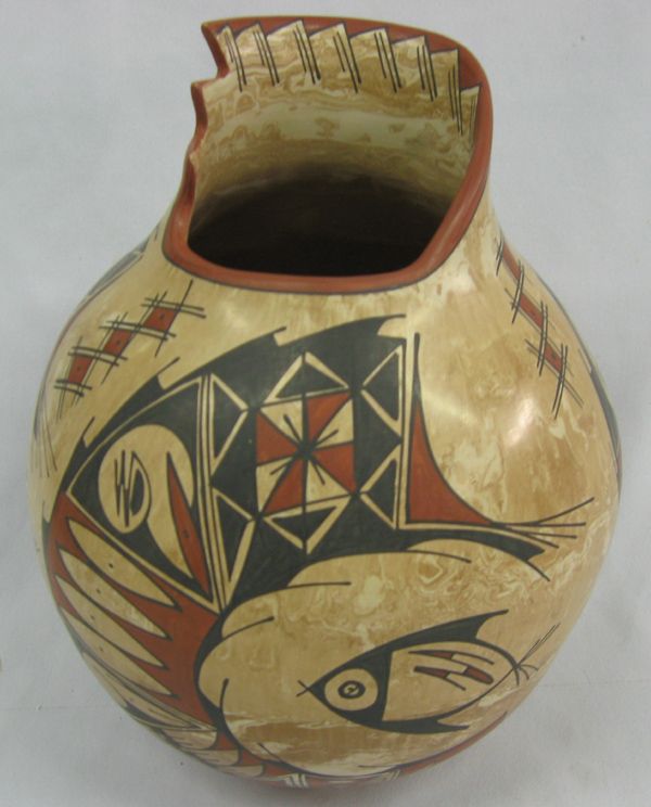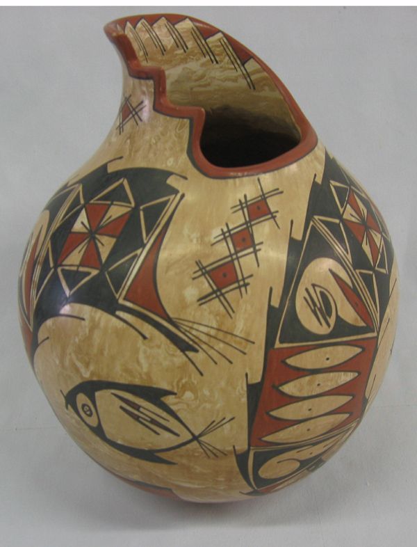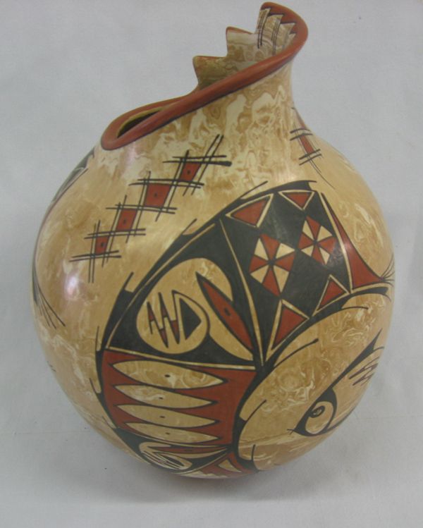 Mata Ortiz Polychrome Cutaway Rim Marbleized Clay Jar by Lorana Gonzalez, measures 10.5''H x 8.5''W, Paquime' inspired geometric and abstract designs, sgraffito signed on bottom by artist