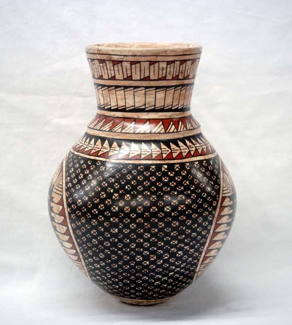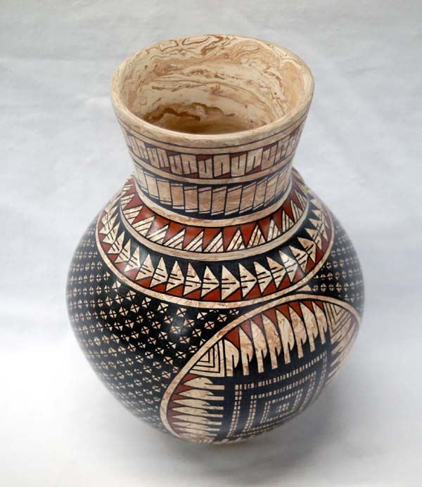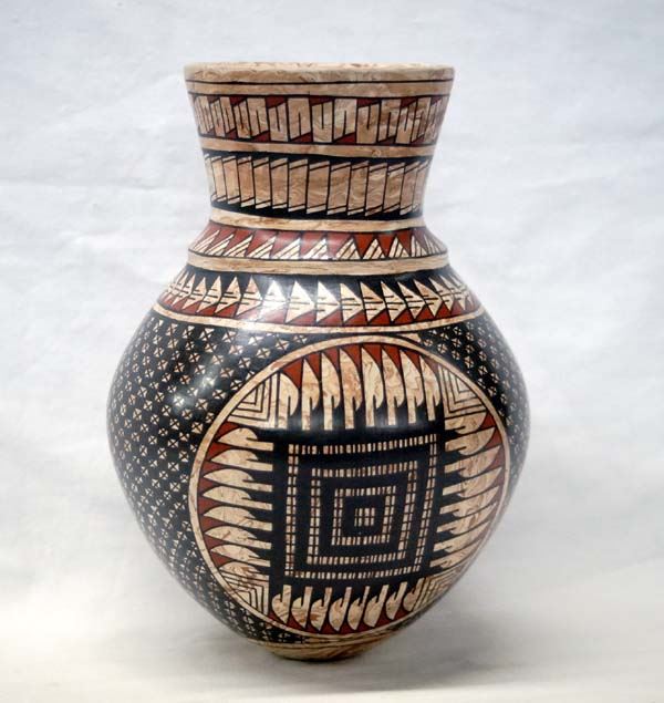 Mata Ortiz Polychrome Eye Dazzler Jar by Lupita Ortiz, measures 8.5''H x 6''D, signed by artist, features stylized feathers and eye dazzling designs