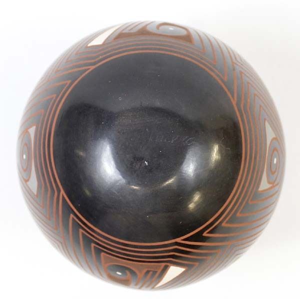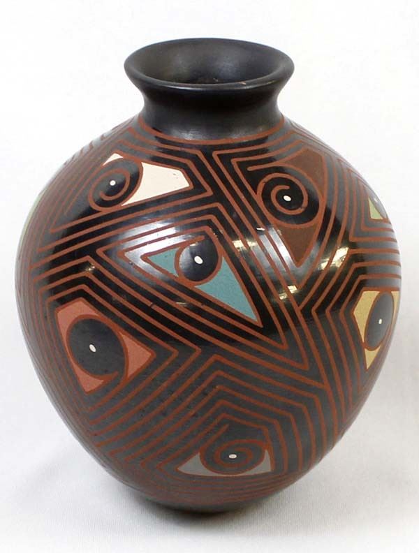 Mata Ortiz Polychrome Eye Dazzler Pot by Lidia Lucero, flared rim, pulled spout, measures 5'' x 6'' and is signed on the bottom