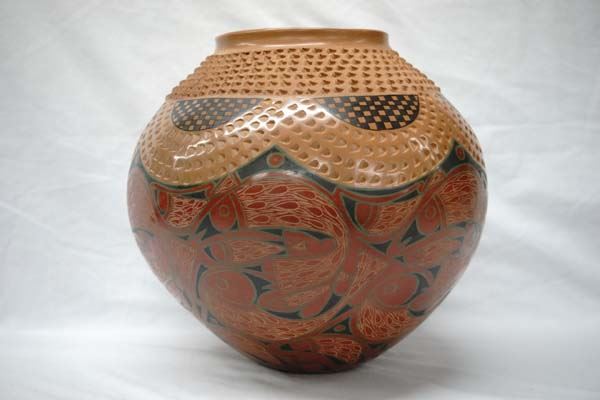 Mata Ortiz Polychrome Fish Jar by Daniel Gonzalez, measures 11''H x 11.5''D, textured top half, features M.C. Escher style fish with carved scales, some checkerboard details, very busy jar which is indicative of Daniel's work