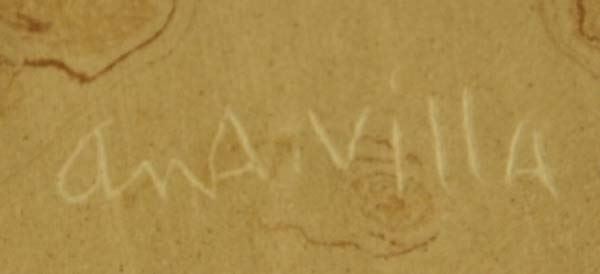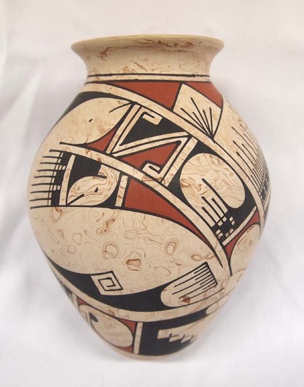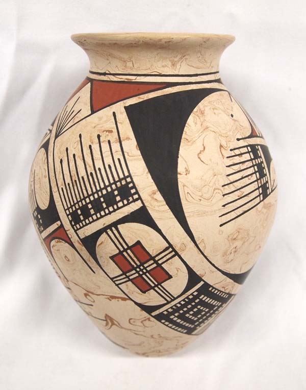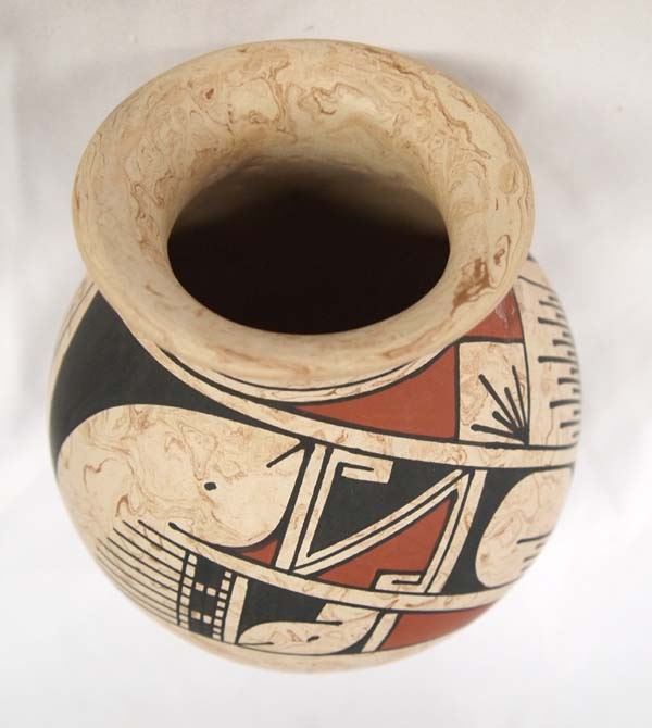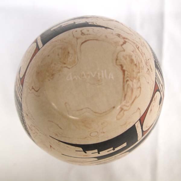 Mata Ortiz Polychrome Geometric Marbleized Clay Jar by Ana Villa, measures 7.5''H x 5.5D, features Paquime inspired designs, flared rim, signed on bottom by artist