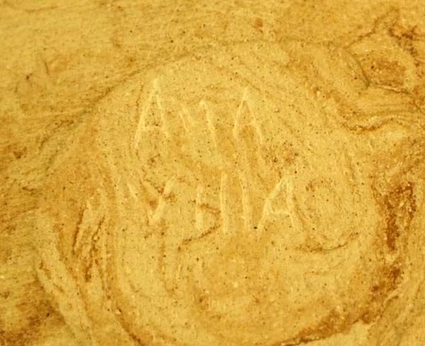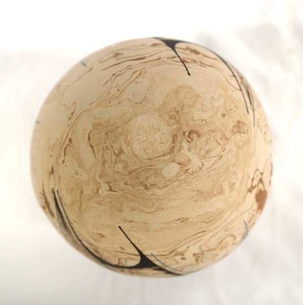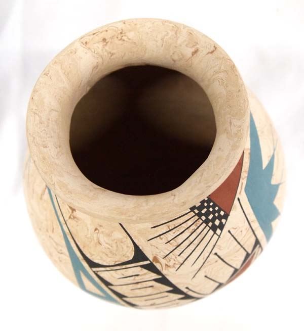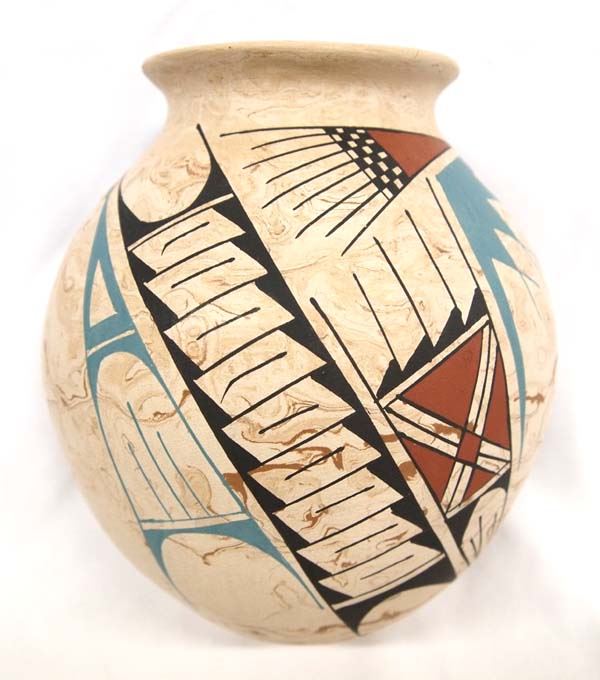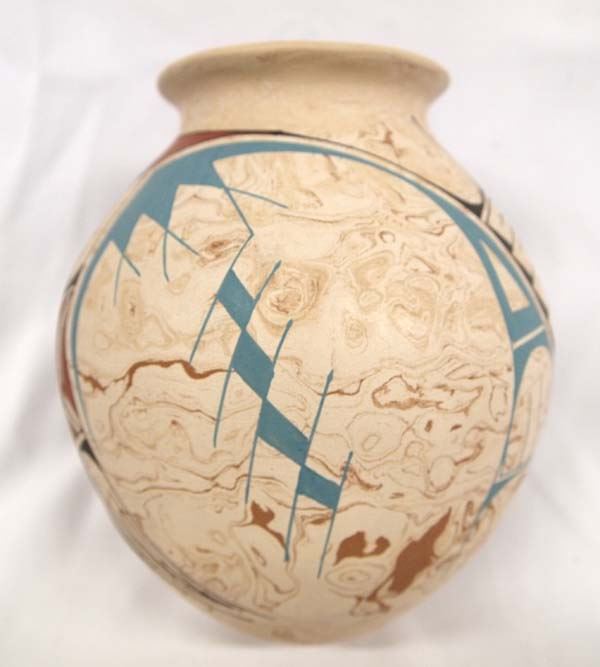 Mata Ortiz Polychrome Geometric Jar by Ana Villa, measures 7''H x 6''D, marbleized clay, features Paquime inspired lines and designs, signed on bottom by artist