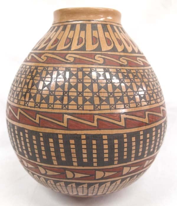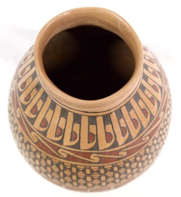 Mata Ortiz Polychrome Geometric Jar by Daniel Gonzalez, measures 9.5''H x 8.5''D, signed on bottom by artist