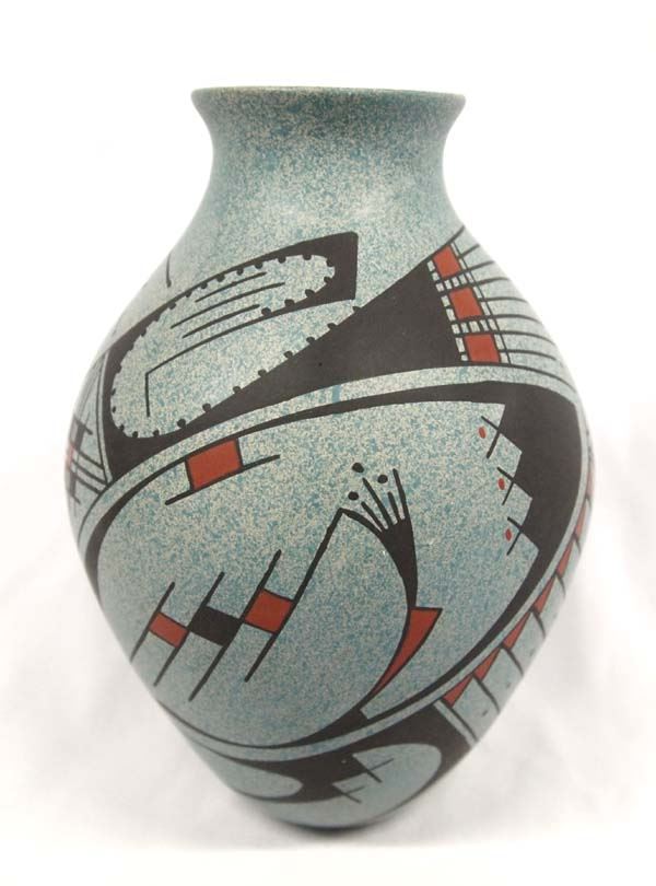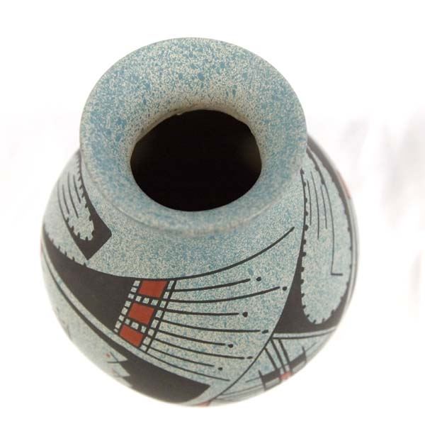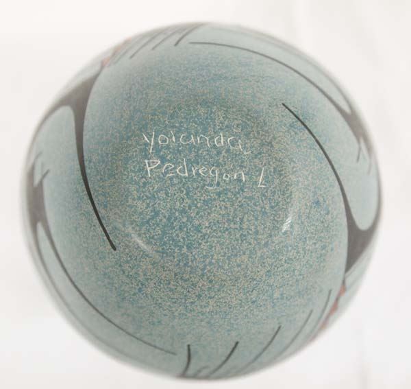 Mata Ortiz Polychrome Geometric Jar by Yolanda Pedregon, spatter painted teal background, features Paquime inspired lines and designs, signed on bottom by artist, measures 7''H x 5''D