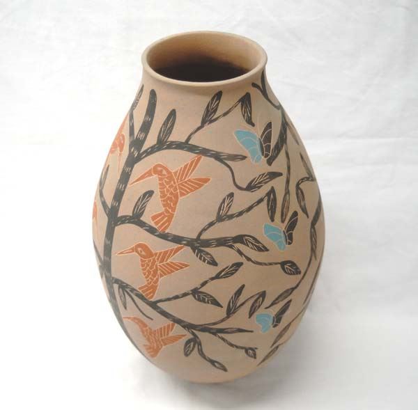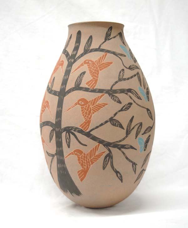 Mata Ortiz Polychrome Hummingbird & Butterfly Jar by Irving Mora, sgraffito accents, measures 13''H x 8.5''D, signed by artist
