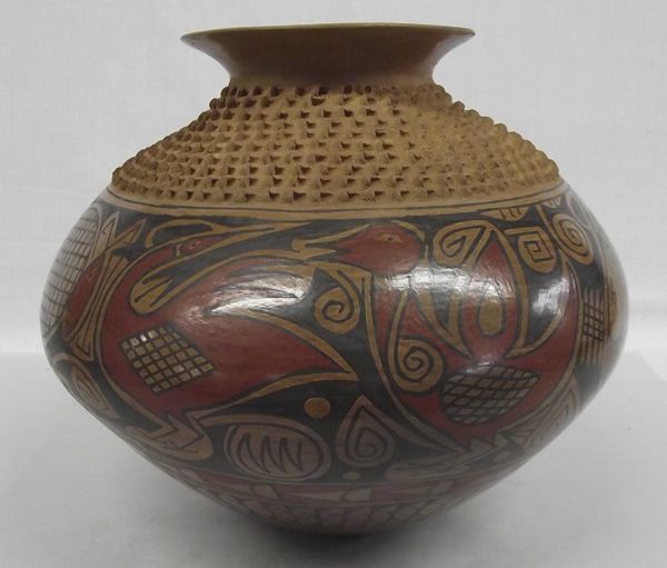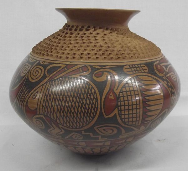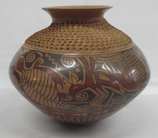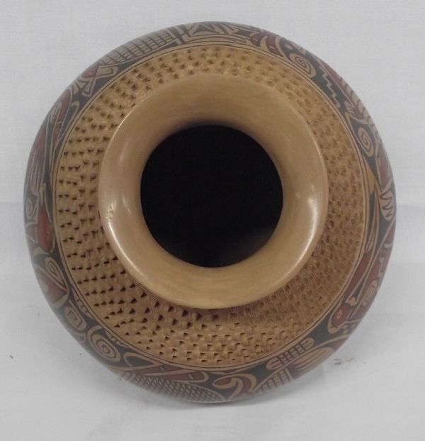 Mata Ortiz Polychrome Jar - Daniel Gonzalez. Many animals and insects surround the middle of this jar by Daniel Gonzalez. The rim is textured and the bottom part of the jar has feather designs. A fanciful and pleasing work in deep reddish clay background with red and black painted designs. It measures 9''H x 11'', and is signed on the bottom. Mata Ortiz is a small village in the state of Chihuahua, Mexico. The potters of Mata Ortiz create contemporary works of art, often incorporating Mimbres designs shared by the Southwest, Native American cultures.