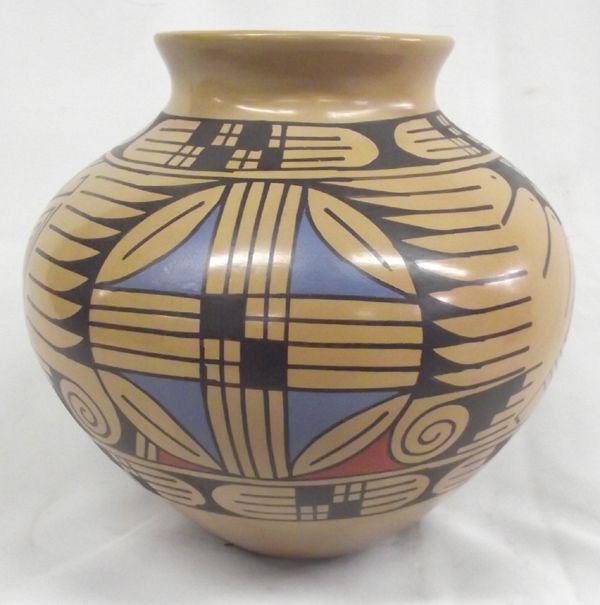 Mata Ortiz Polychrome Jar - Jesus Tina. Zia designs with geometric figures in rust, black, tan and blue show beautifully on this jar. 8''H x 8.5'' diameter.