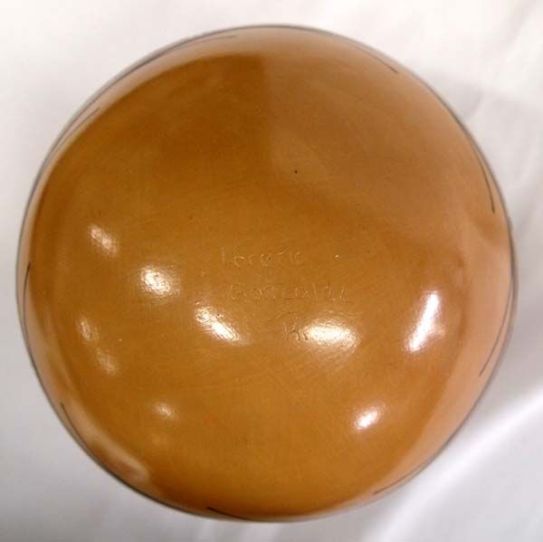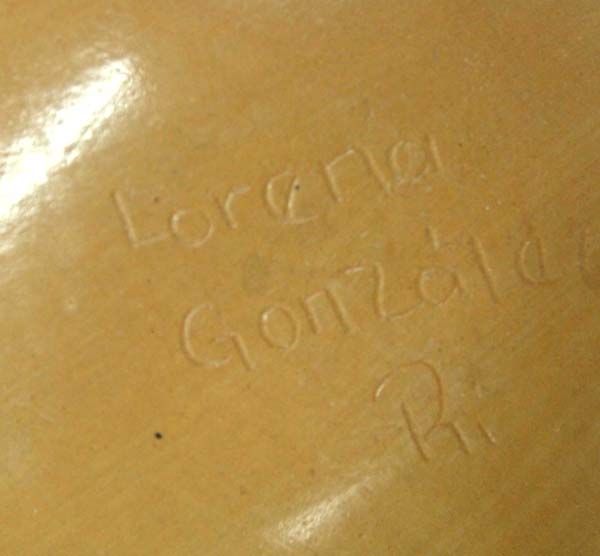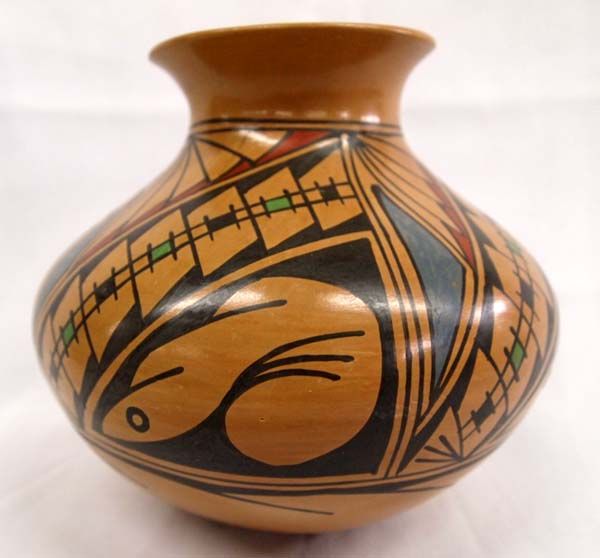 Mata Ortiz Polychrome Jar - Lorena Gonzalez R. Cute little Casas Grande style jar in brown background with black, red and blue designs. Signed on the bottom, Lorena Gonzalez R. Measures 6.25''Hx6.5''D.