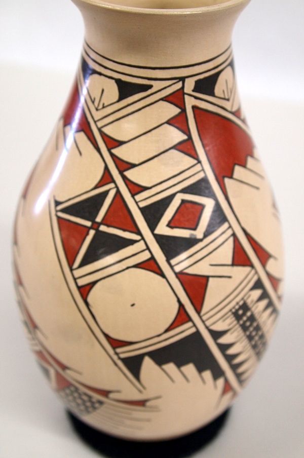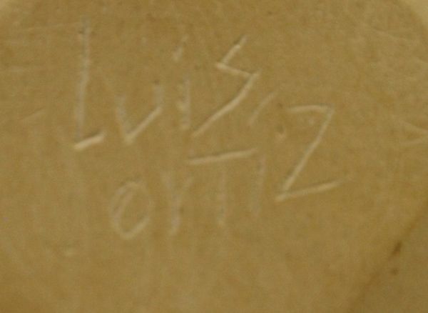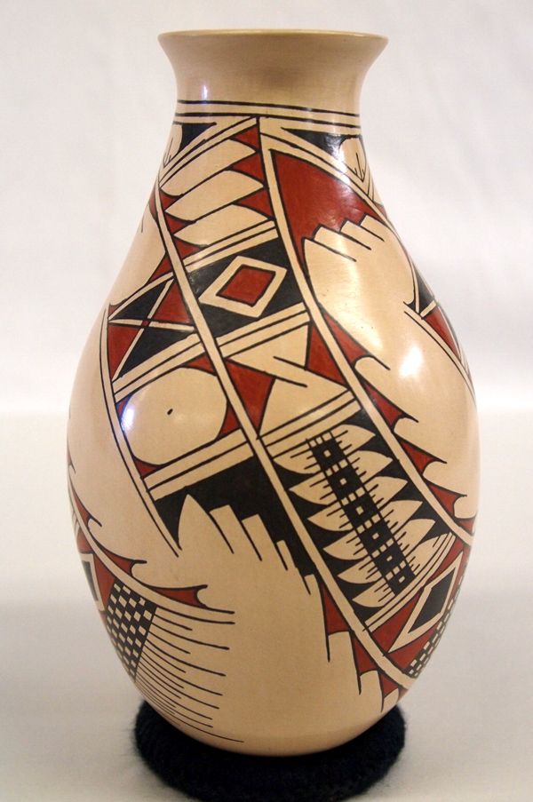 Mata Ortiz Polychrome Jar - Luiz Ortiz. Light tan jar with red and black stylized designs. Signed on the bottom by the artist. Measures 8''H x 4.5''W. Mata Ortiz is a small village in the state of Chihuahua, Mexico. The potters of Mata Ortiz create contemporary works of art, often incorporating Mimbres designs shared by the Southwest, Native American cultures.
