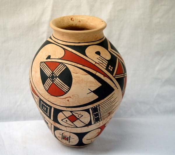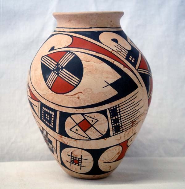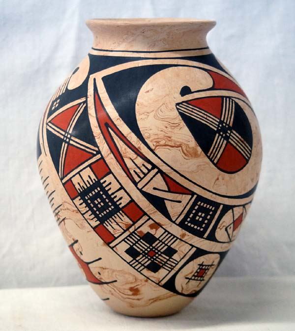 Mata Ortiz Polychrome Jar by Briana Villa, measures 7''H x 5.25''D, features Paquime inspired designs on marbleized clay