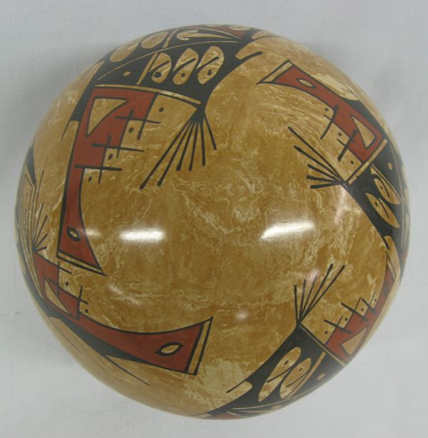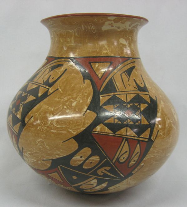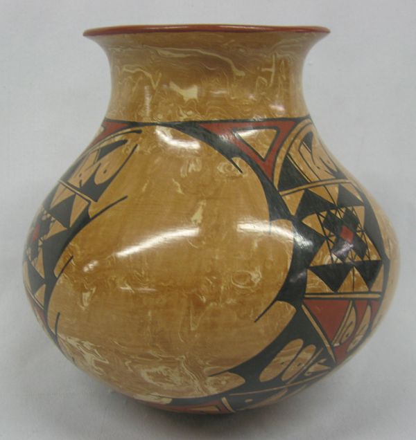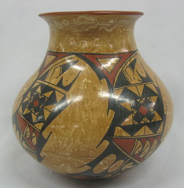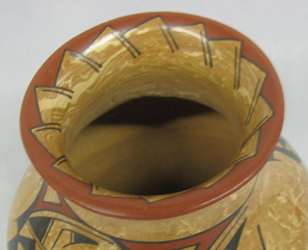 Mata Ortiz Polychrome Marbleized Clay Jar by Lorena Gonzalez Rios, measures 6.25''H x 6.5''W, sgraffito signature by artist on bottom, Paquime' inspired geometric and abstract designs,