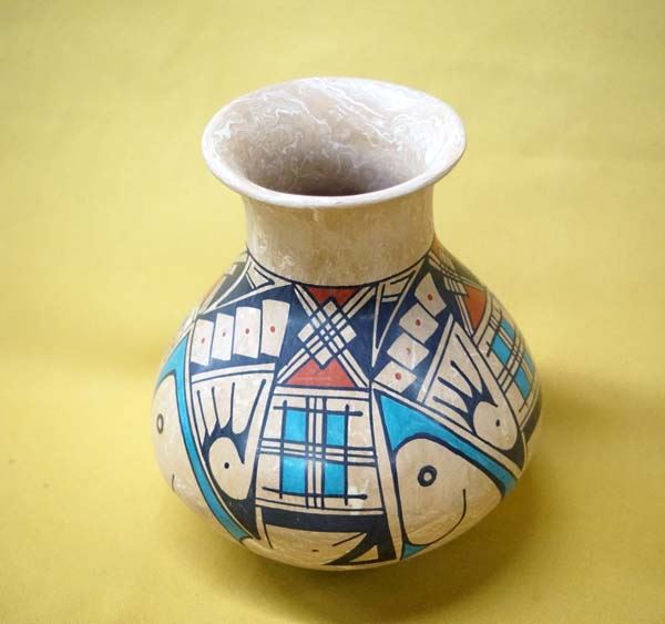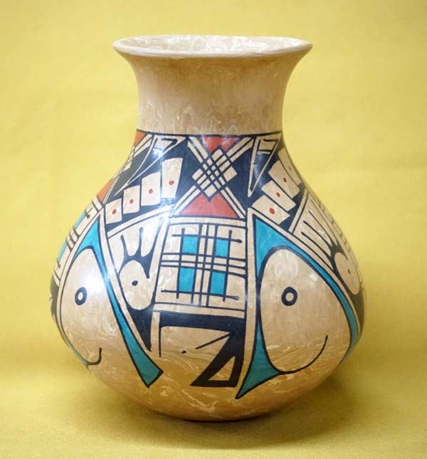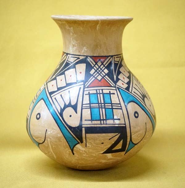 Mata Ortiz Polychrome Jar by Lorena Gonzalez Rios, marbleized clay, measures 7''H x 6''D, signed by artist