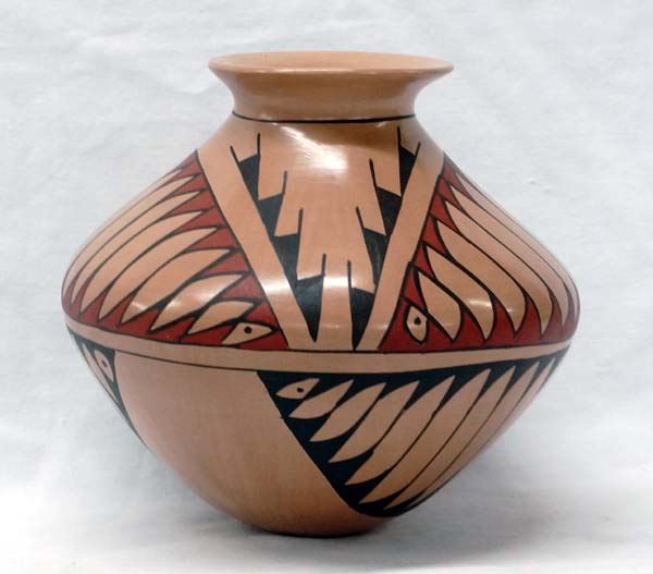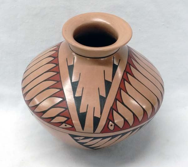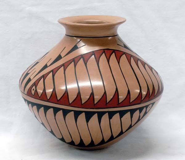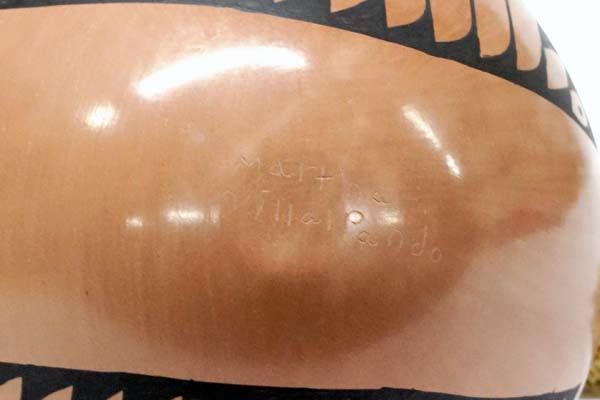 Mata Ortiz Polychrome Jar by Martha Villapondo, measures 5.5'' x 6''D, stylized feather design, signed by artist