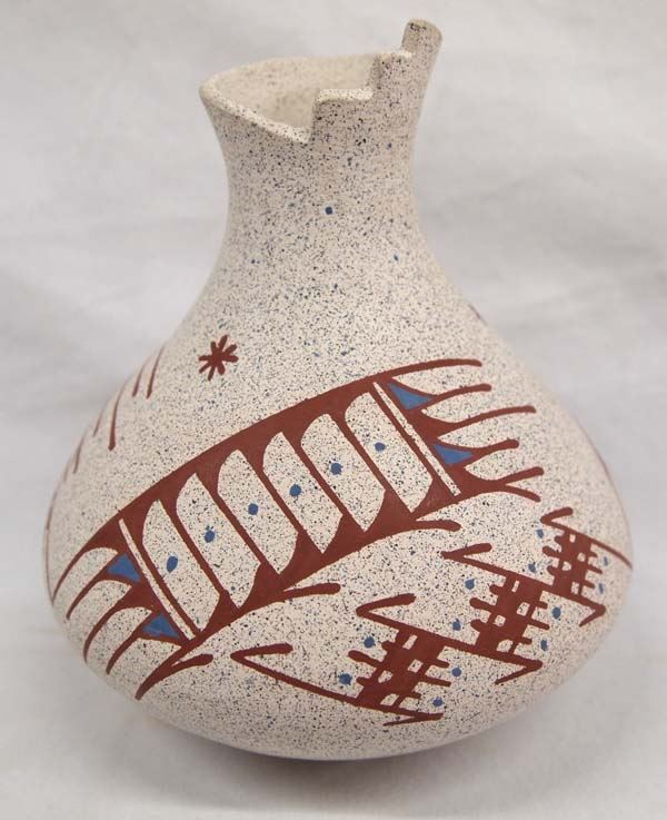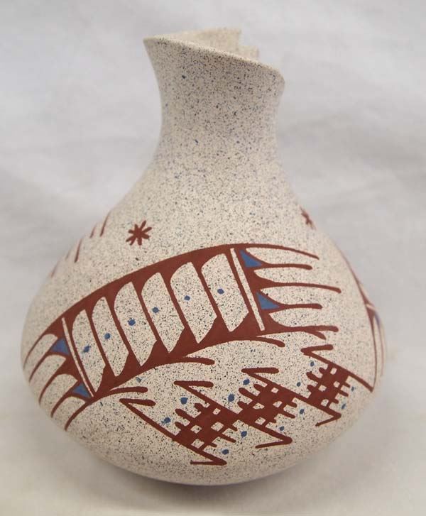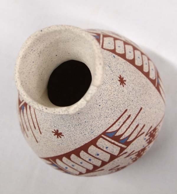 Beautiful Mata Ortiz Polychrome Jar by Mary Lopez, fabulous cutaway rim, signed on bottom by artist, measures 5.5''H x 5''D, spattered base paint, geometric designs
