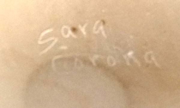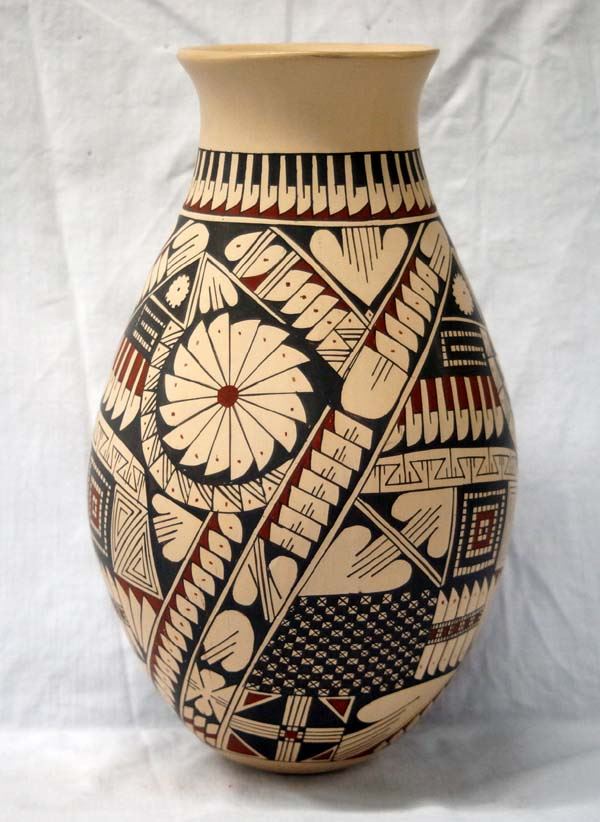 Sensational Mata Ortiz Polychrome Jar by Sara Corona, measures 12''H x 7''D, features gorgeous Paquime inspired lines and designs, whirling and stylized feather designs also, signed on bottom by artist
