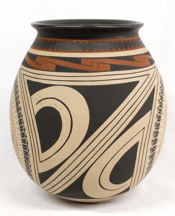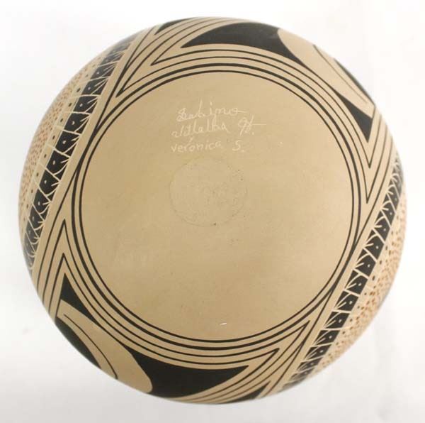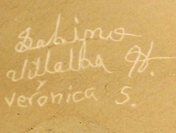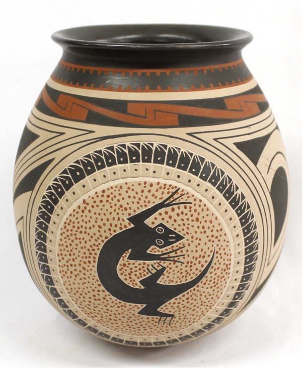 Mata Ortiz Polychrome Jar by Sabino Villalba H. & Veronica S., measures 7'' x 7.5'', beautifully carved details, lizard and stylized feather motif, signed on the bottom