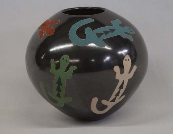 Mata Ortiz Polychrome Lizard Jar by Joli Armerez, measures 5.5''H x 6.5''W, features multi-colored lizards all over jar