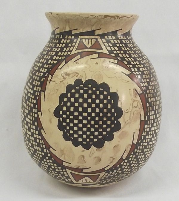 Mata Ortiz Polychrome Marbelized Jar - Luis Oritz. Three cirlces surround the jar with black rosette type designs. Eye dazzler squares and diamonds fill the areas inbetween. Signed on the bottom by artist, Luis Ortiz. Measures 7''H x 6''W. Mata Ortiz is a small village in the state of Chihuahua, Mexico. The potters of Mata Ortiz create contemporary works of art, often incorporating Mimbres designs shared by the Southwest, Native American cultures.