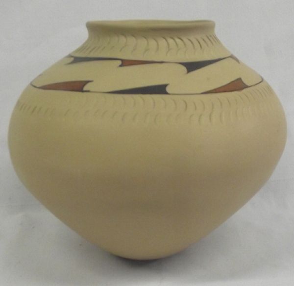 Mata Ortiz Polychrome Olla by Ivon Quezada, measures 7.5'' x 9, some texturing, geometric wave design around rim, signed on bottom by artist