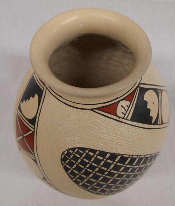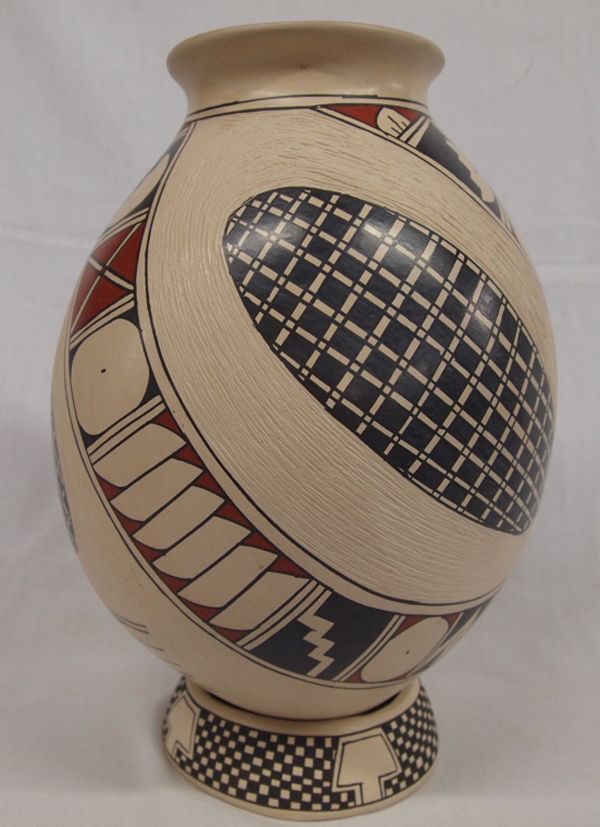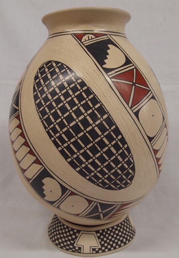 Mata Ortiz Polychrome Olla with Stand by Luis Ortis, measures 12''H x 9''W and pottery ring measures 2'' x 6''D, beautiful Paquime' inspired designs, sgraffito signature on bottom