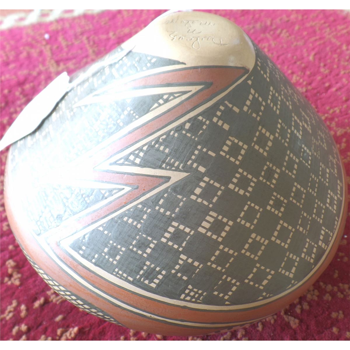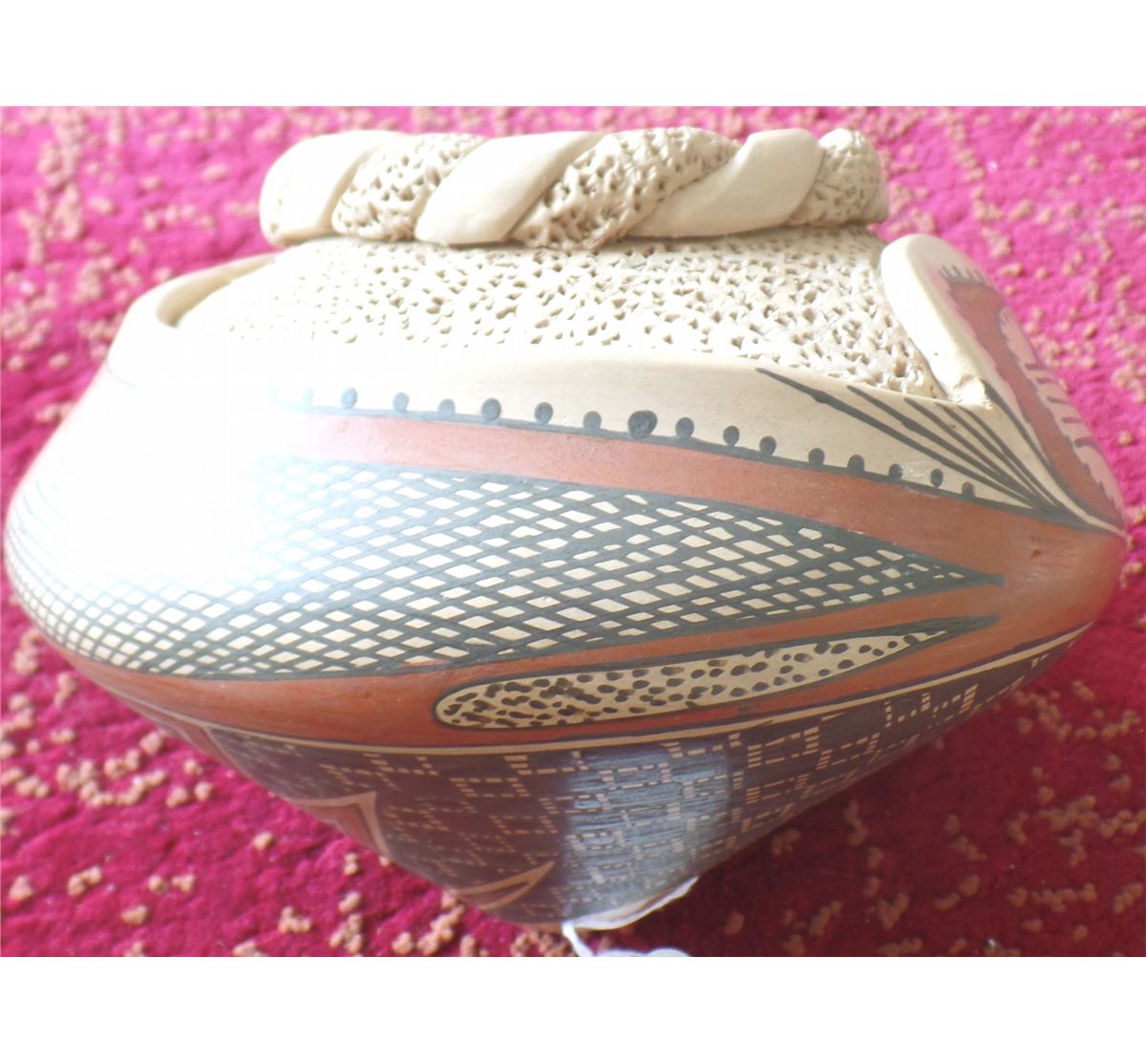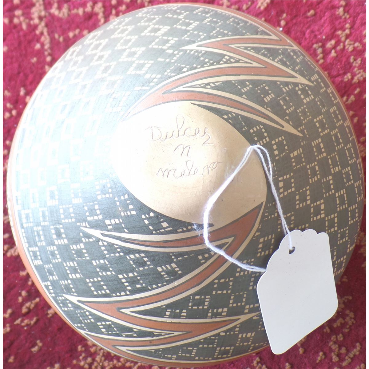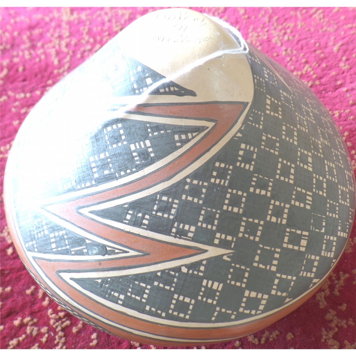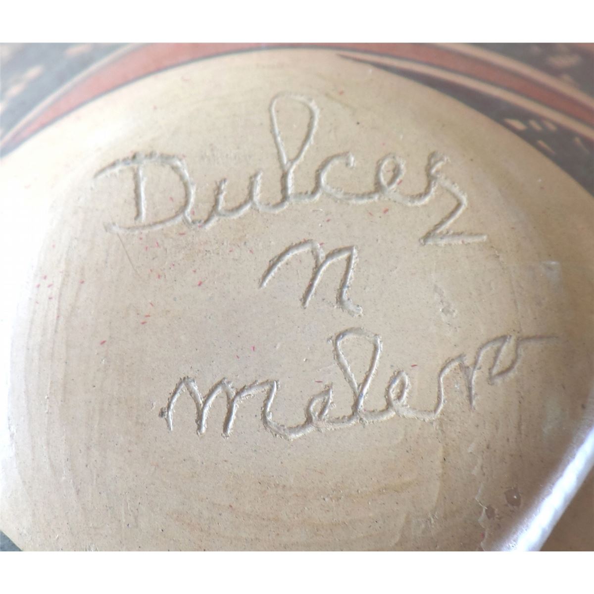 Mata Ortiz polychrome olla, signed by Dulcez n Meleno. This item is from the 1970's and measures 8x6 inches. It has a fancy geometric design with braided rim and lightening strikes. Condition: Very Fine Shipping: 30 must be double boxed