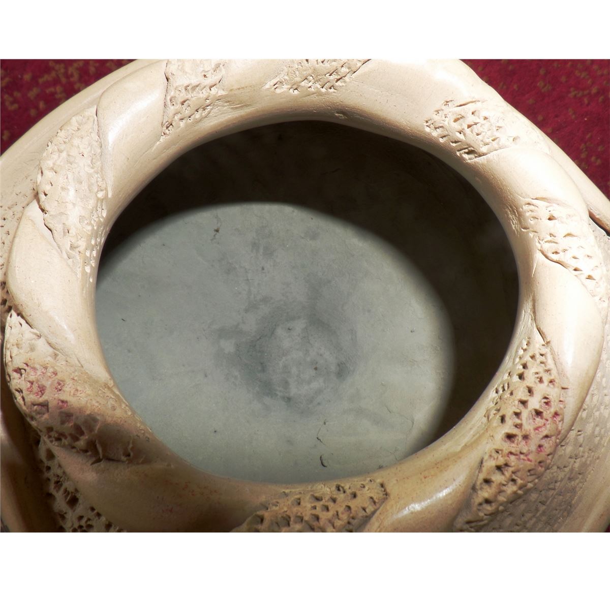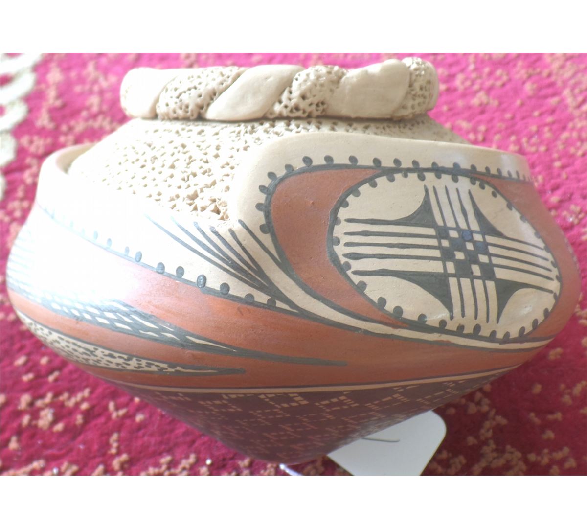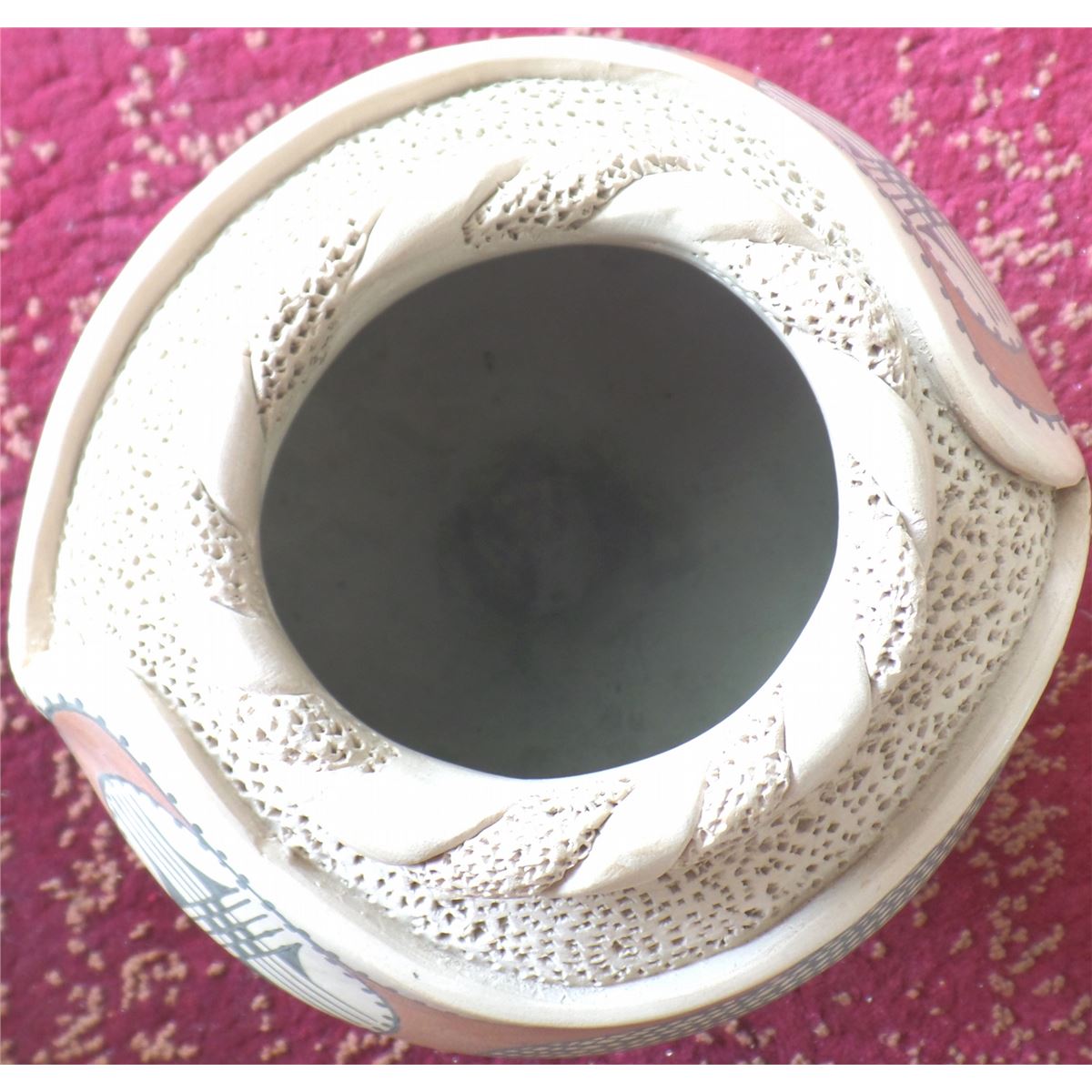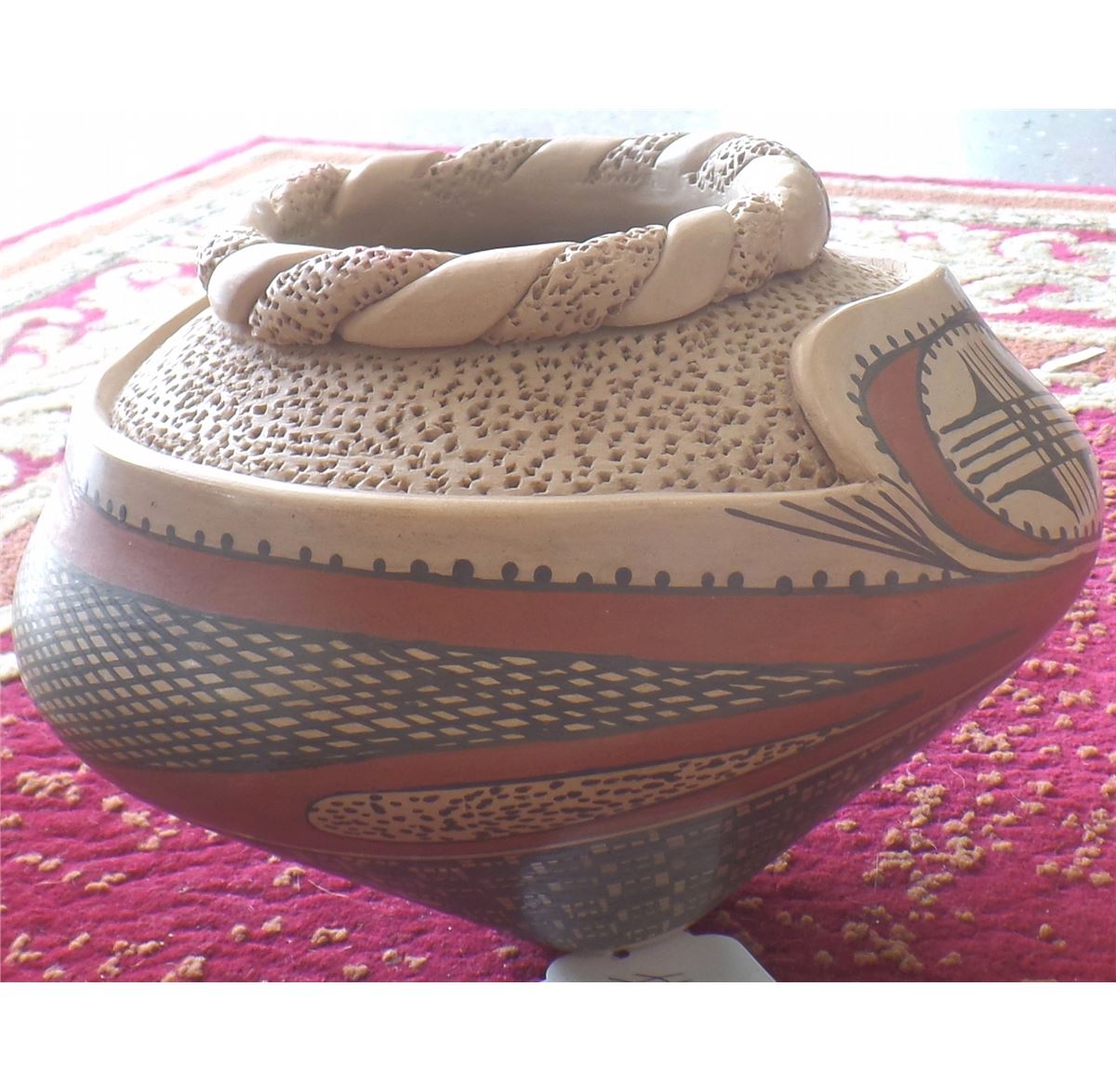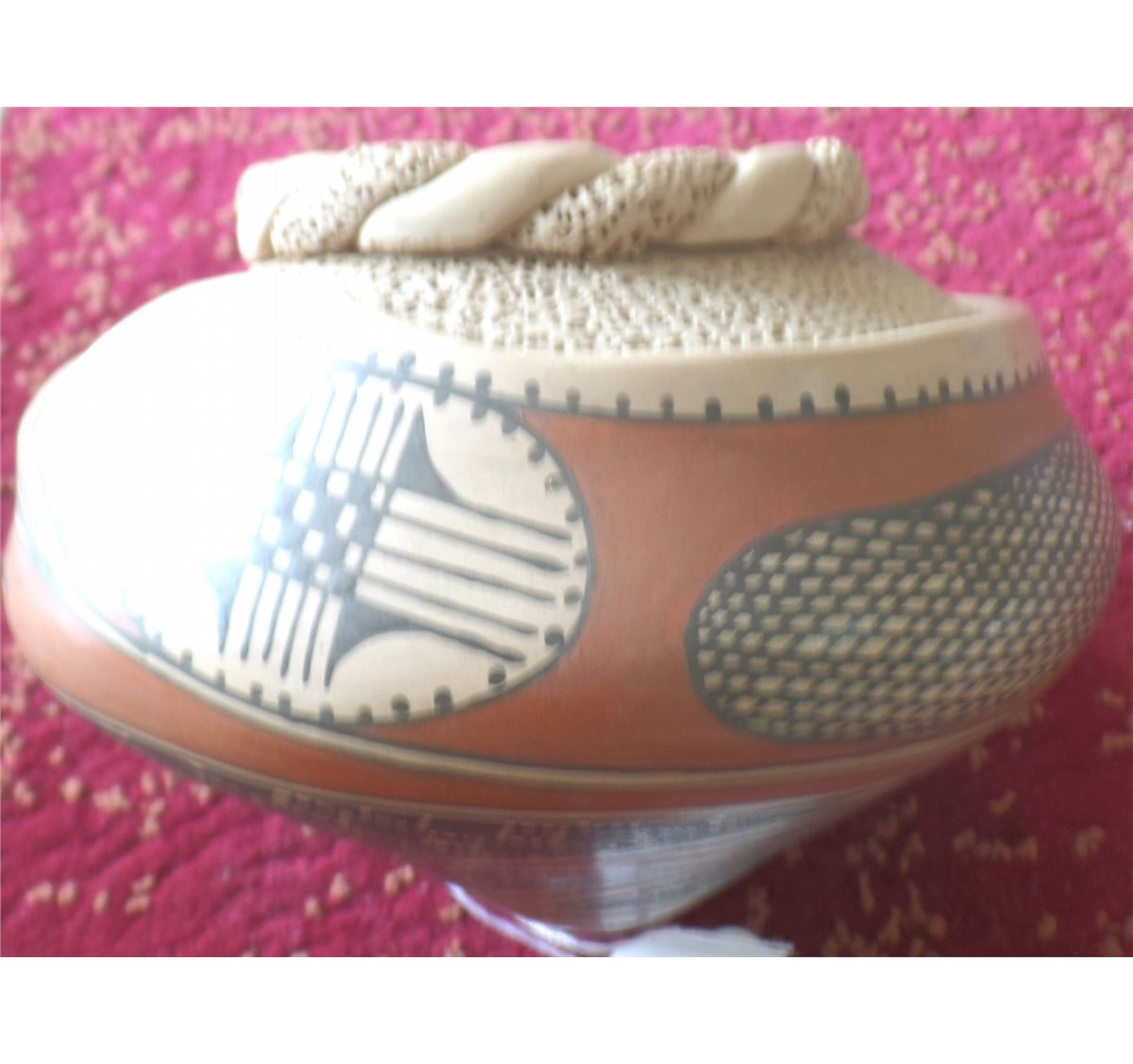 Mata Ortiz polychrome olla, signed by Dulcez n Meleno. This item is from the 1970's and measures 8x6 inches. It has a fancy geometric design with braided rim and lightening strikes. Condition: Very Fine Shipping: 30 must be double boxed