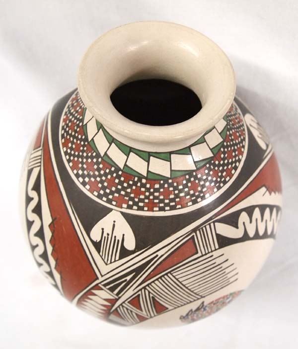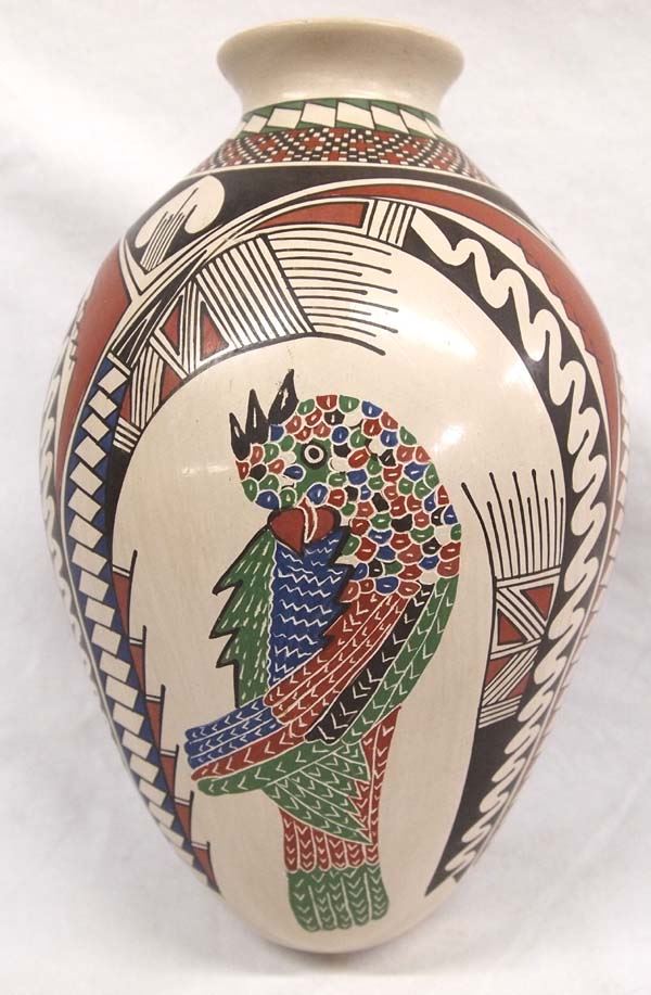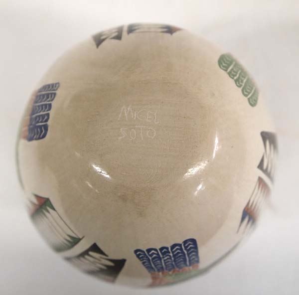 Stunning Mata Ortiz Polychrome Parrot Jar by Migel Soto, signed on bottom by artist, sgraffito parrots amidst Paquime' inspired designs, measures 10.5''H x 7''D