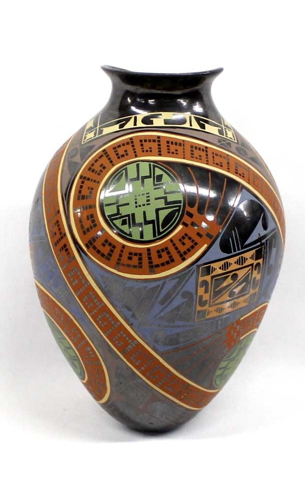 Mata Ortiz Polychrome Pottery Jar by Alonso Meraz, measures 6.5'' x 9.5'' and is signed by the artist, stunning lines and designs amidst beautiful vibrant colors, fabulous cutaway rim