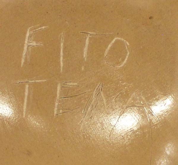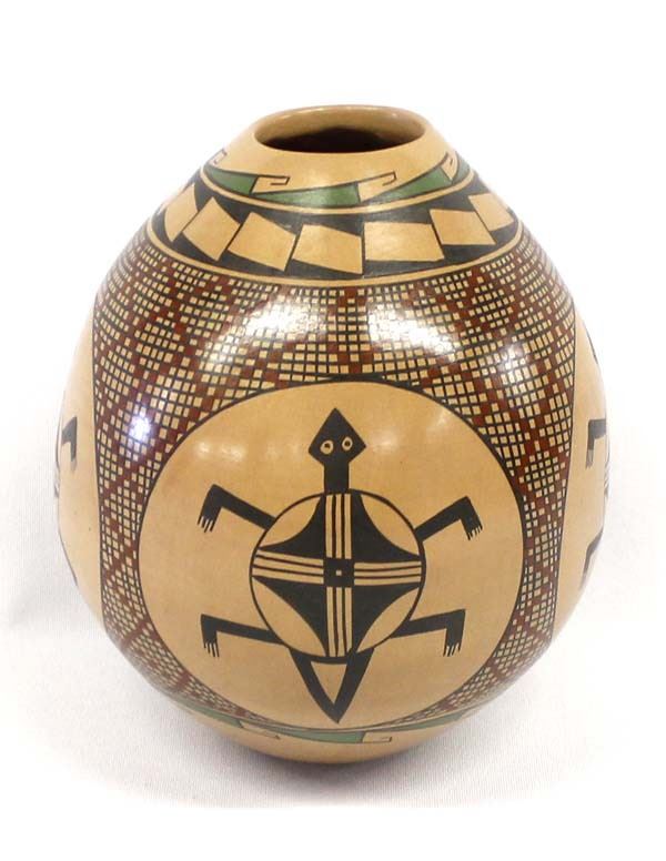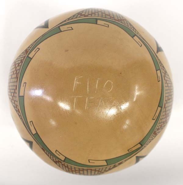 Mata Ortiz Polychrome Pottery Jar by Fito Tena, measures 5.5'' x 6.5'' and is signed on the bottom, features turtle motif and embellished with eye dazzler borders