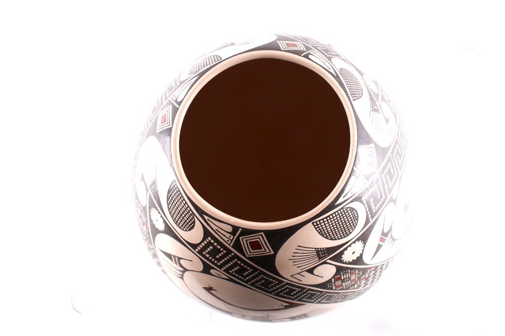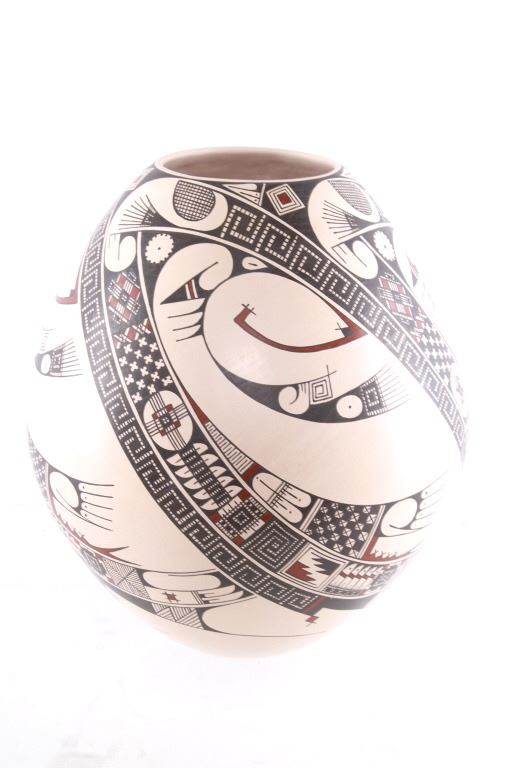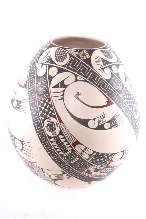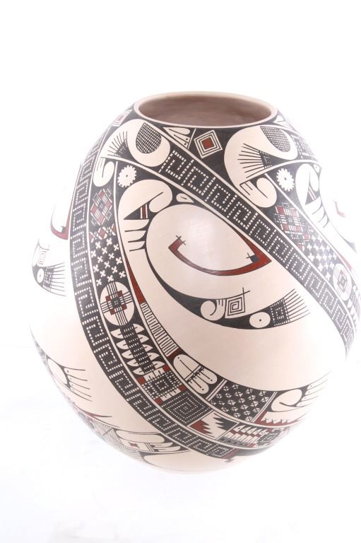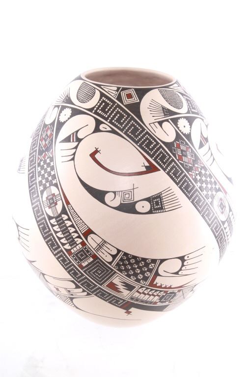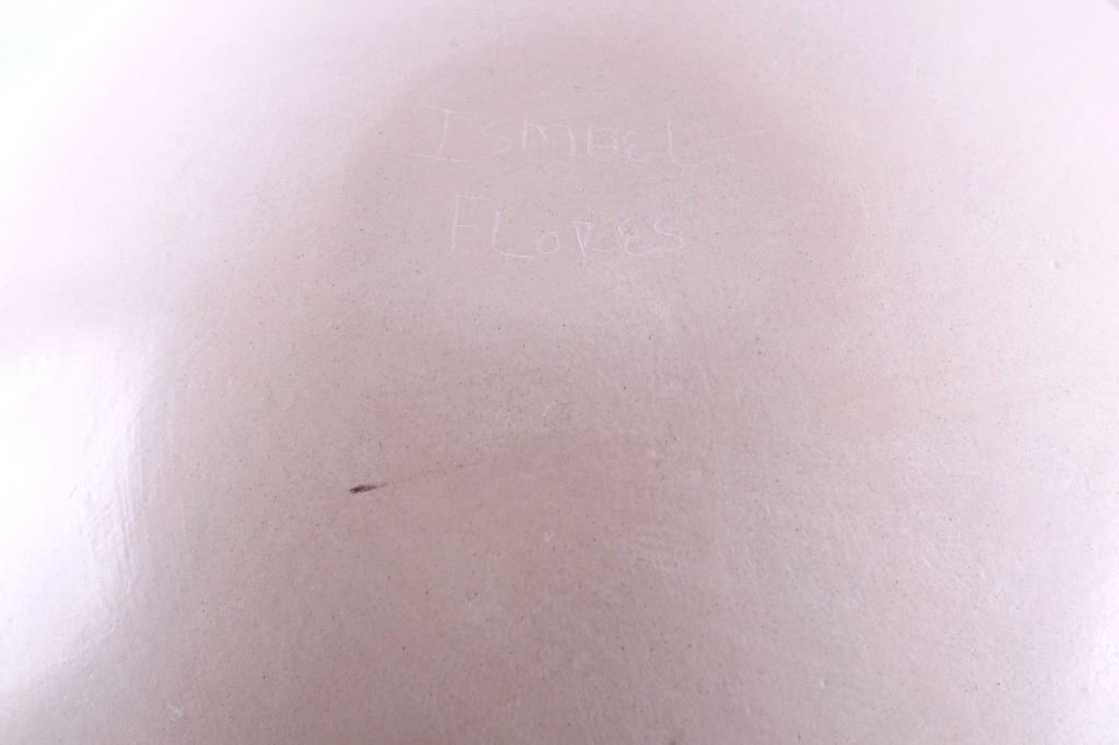Featured in this lot is this Mata Ortiz polychrome pottery vessel by Ismael Flores. The pottery vessel features a wonderfully and professionally crafted ceramic construction that shows polychrome decoration of geometric patterns on a cream field of the sidewalling. The pottery vessel is marked on the bottom: Ismael Flores. Mata Ortiz pottery is a recreation of the Mogollon pottery found in and around the archeological site of Casas Grandes (Paquimé) in the Mexican state of Chihuahua. Named after the modern town of Mata Ortiz, which is near the archeological site, the style was propagated by Juan Quezada Celado. Quezada learned on his own to recreate this ancient pottery and then went on to update it. The condition of this of this pottery vessel is good with no obvious signs of damage and shows good overall condition. The measurements of this pottery vessel is 12 1/2" x 8 1/2" x 8 1/2".