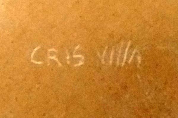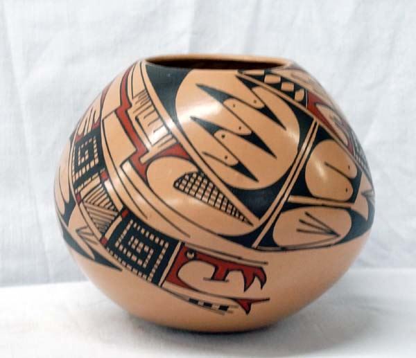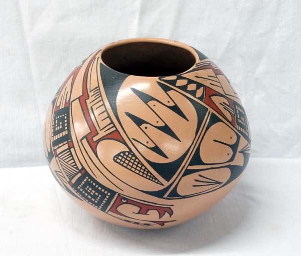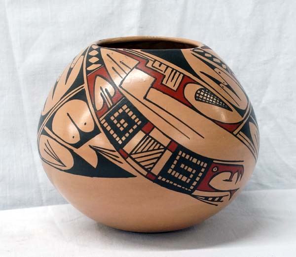 Mata Ortiz Polychrome Seed Jar by Cris Villa, measures 5''H x 6''D, signed on bottom by artist, features Paquime inspired lines and designs