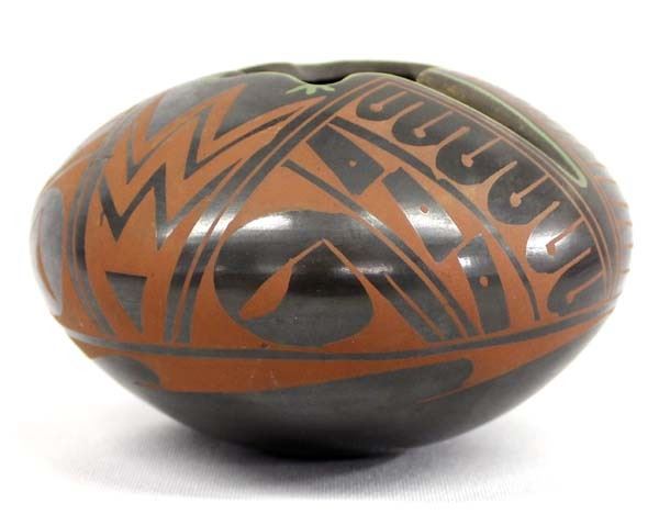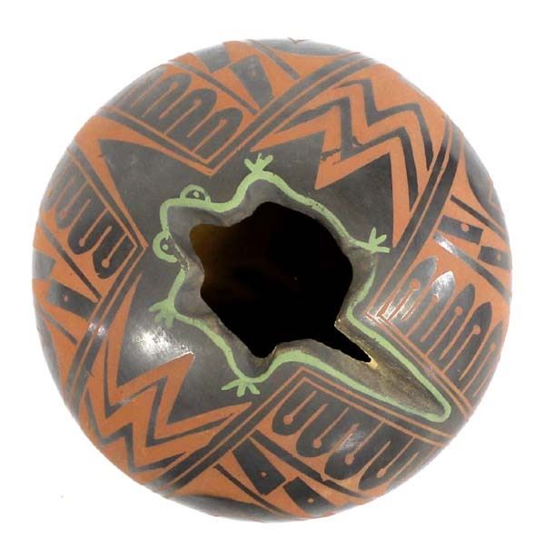 Mata Ortiz Polychrome Seed Jar by Cruz Villa, measures 3'' x 4.25'', unique cutaway lizard opening on top of jar