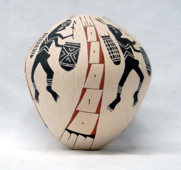 Mata Ortiz Polychrome Seed Jar by Jose Villa, measures 4.5'' x 4''D, signed by artist, depicts anatomically correct warriors