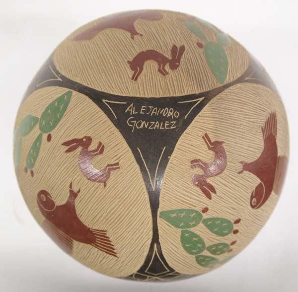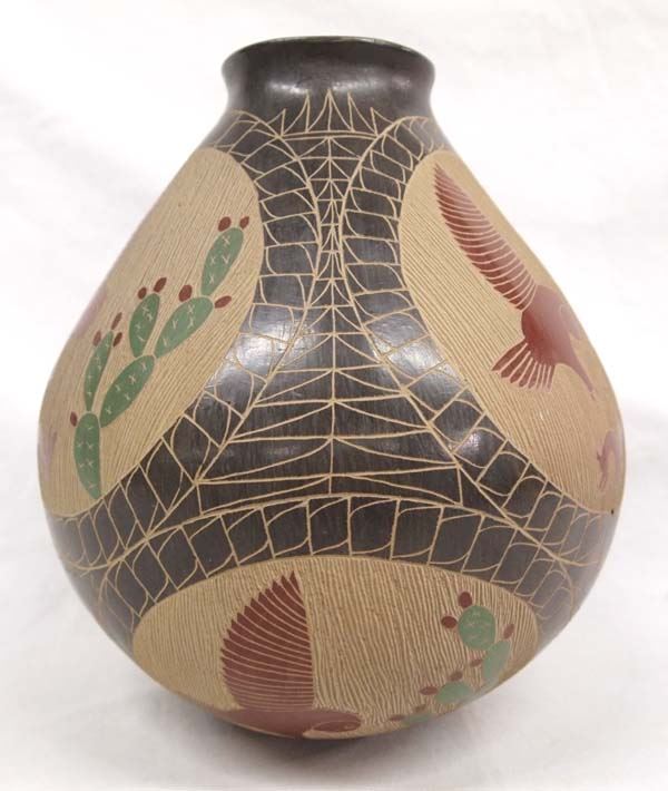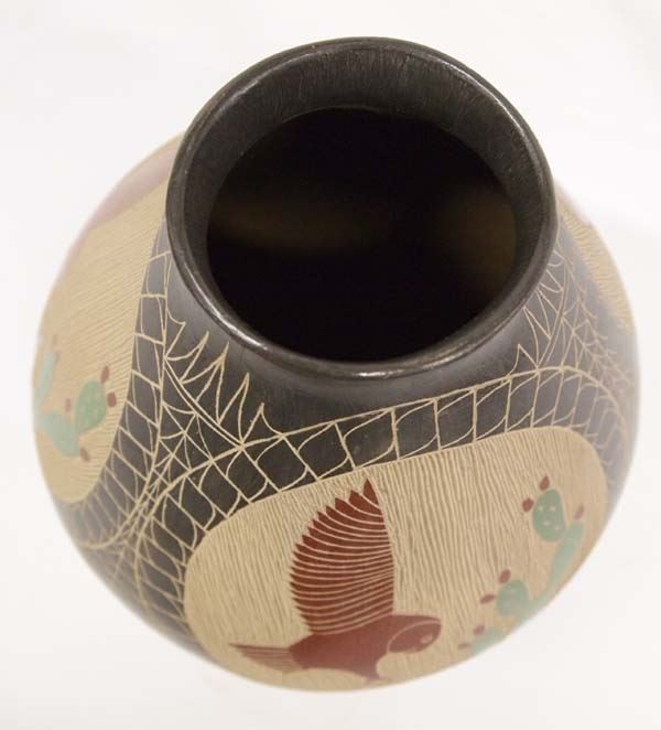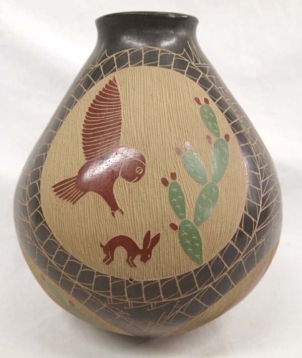 Phenomenal Mata Ortiz Polychrome Owl and Jack Rabbit Sgraffito Jar by Alejandro Gonzalez, signed on bottom by artist, in my opinion, one of the prettiest Mata Ortiz Jars I've ever seen, vessel wide carving featuring stylized feathers, Prickly Pear Cacti, Owls, and Jack Rabbits, measures 9.5''H x 8.5''W