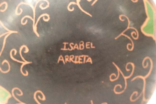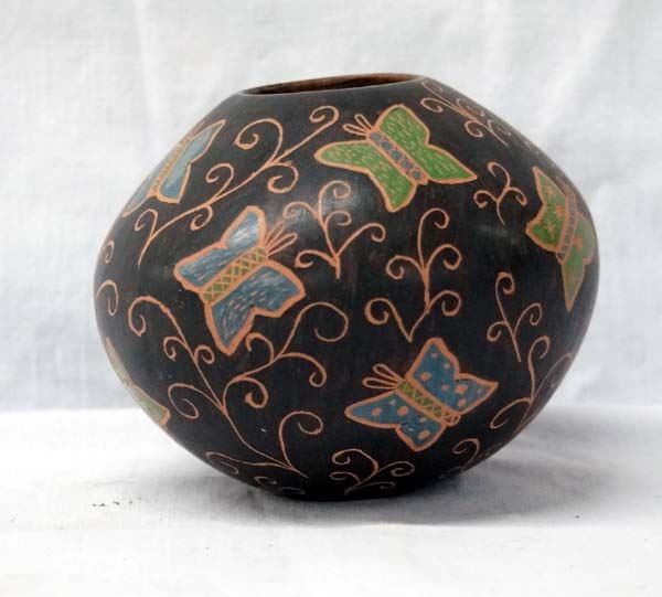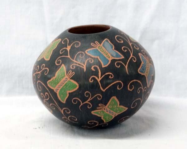 Mata Ortiz Polychrome Sgraffito Jar by Isabel Arrieta, measures 3.5''H x 4''D, features multicolored butterflies and vines