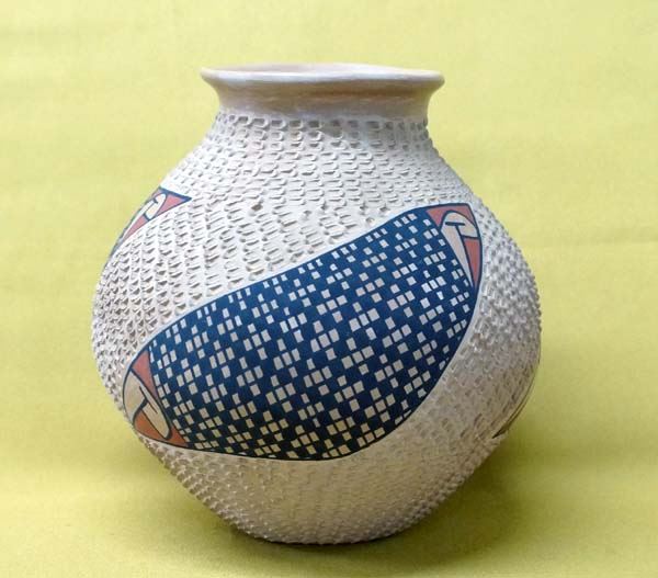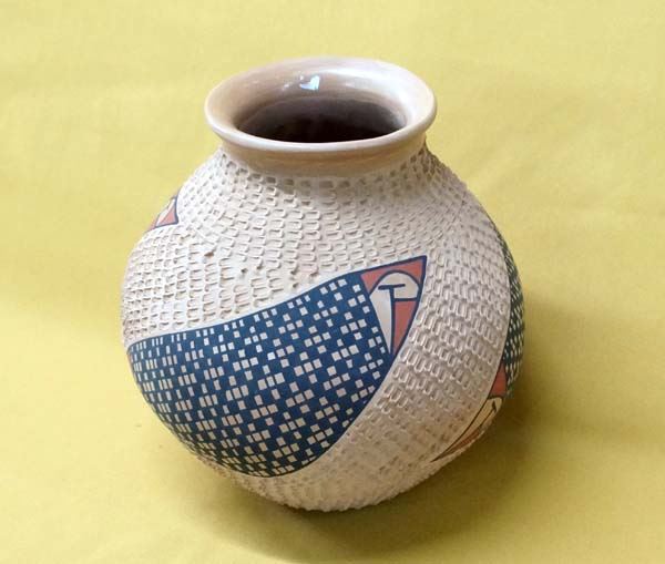 Mata Ortiz Polychrome Textured Jar, signed S.R., measures 8'' x 8''