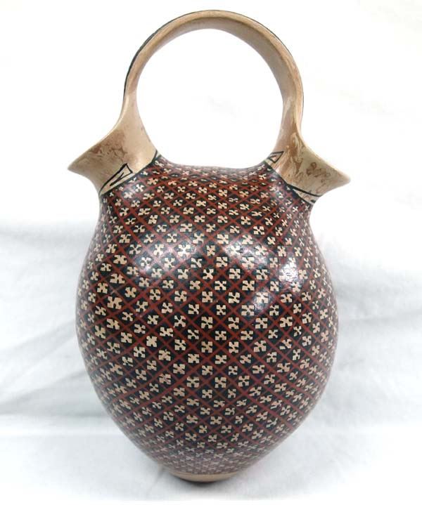 Mata Ortiz Polychrome Wedding Vase by Manuel Mora, measures 8''H x 5.5''D, features predominantly eye dazzling designs on marbleized clay base, signed on bottom by artist