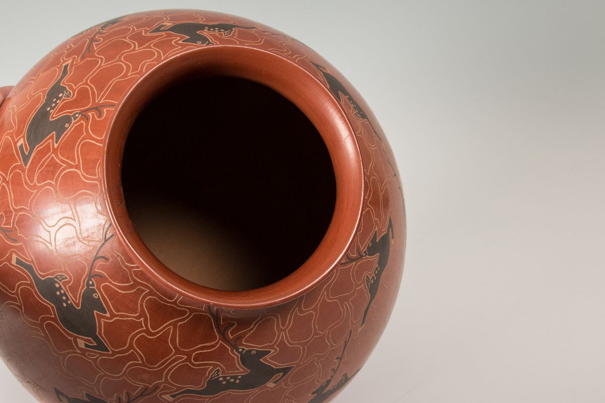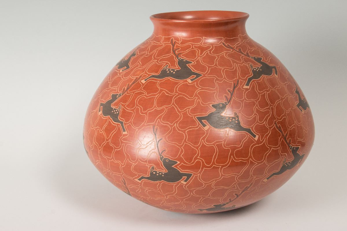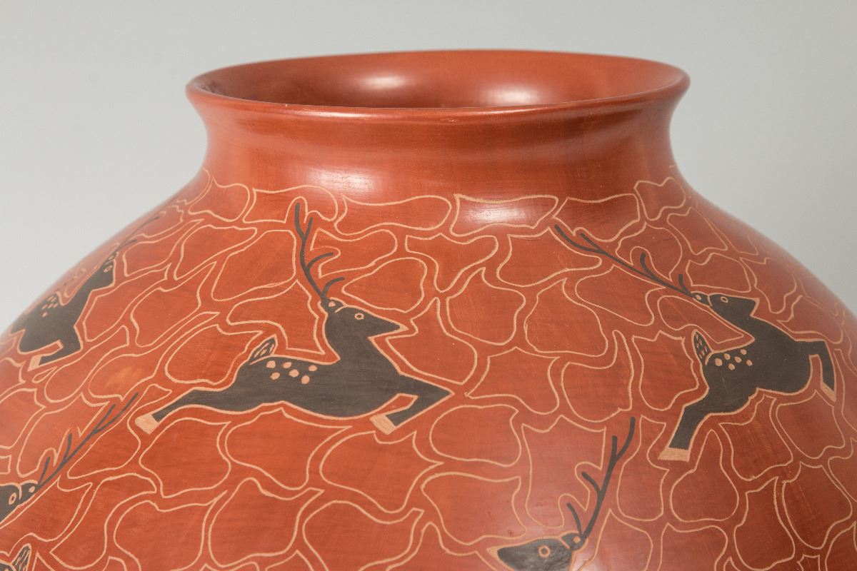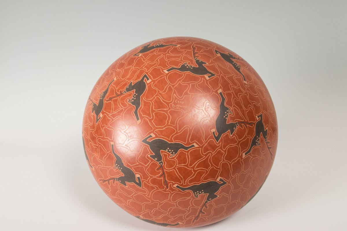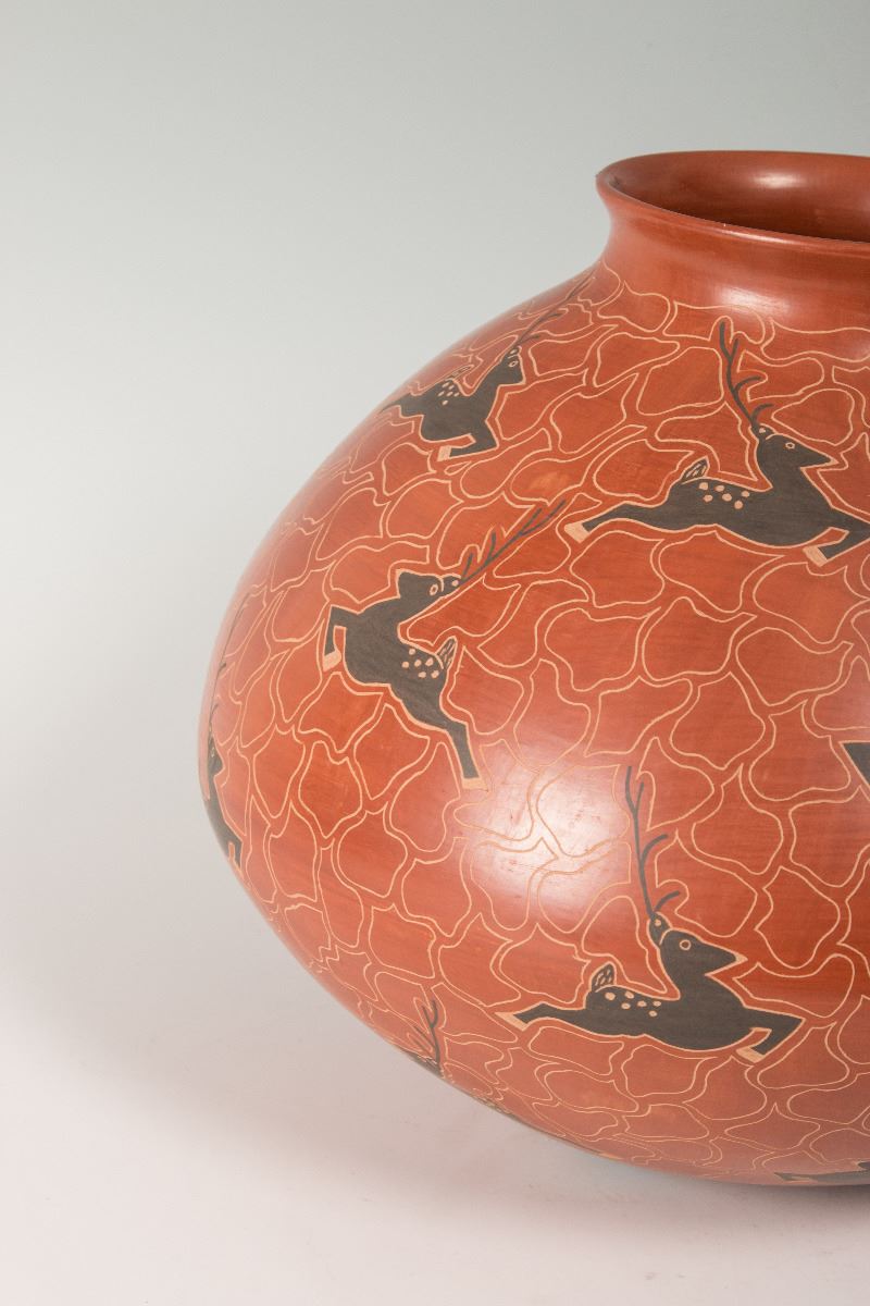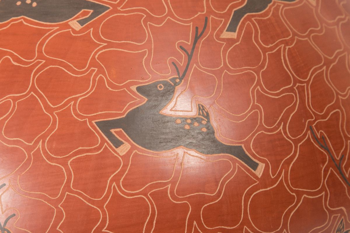 Mata Ortiz Pot by Cecy Burgarini. 11 ½" x 13" with leaping deer motif on a rust colored background. From Casas Grandes Pottery (Chihuahua, Mexico). Signed on bottom: Cecy Burgarini.