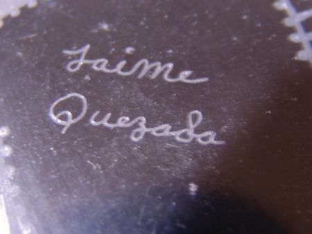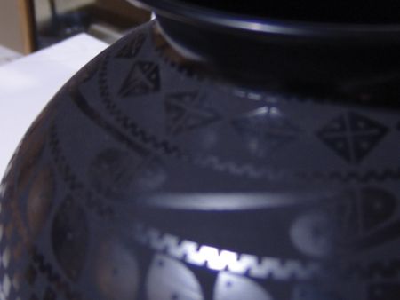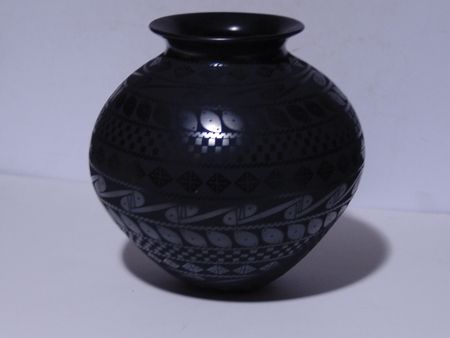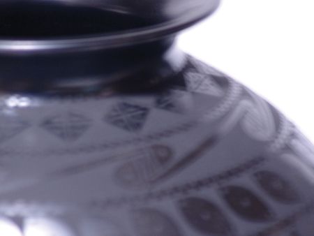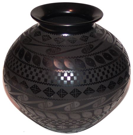 Late 1900s, Fine thin-walled black-on-black pottery jar with intricate painted motif by another of Juan's nephews, (a son of brother Jesus). Very good condition. 9" x 8-1/2"