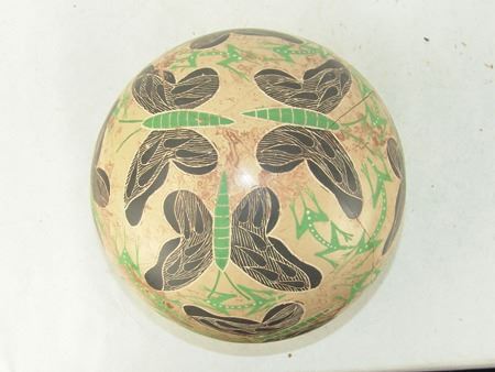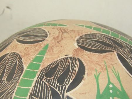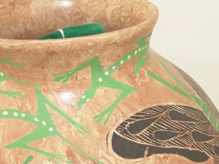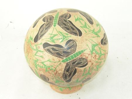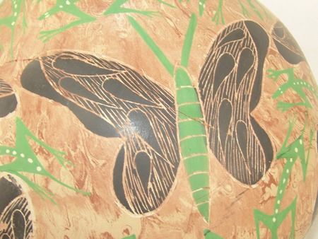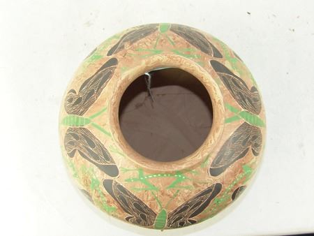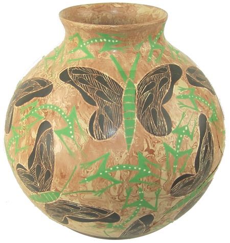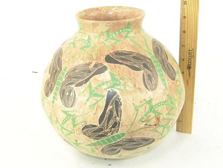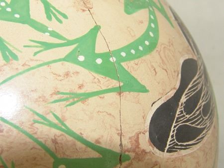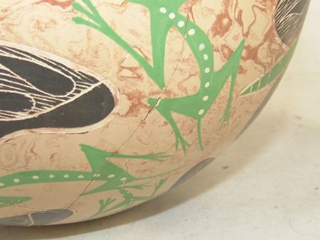 Late 1980s, Early mottled clay thin-walled olla with butterflies and lizards. Beautiful, but broken and glued. 10" x 10"