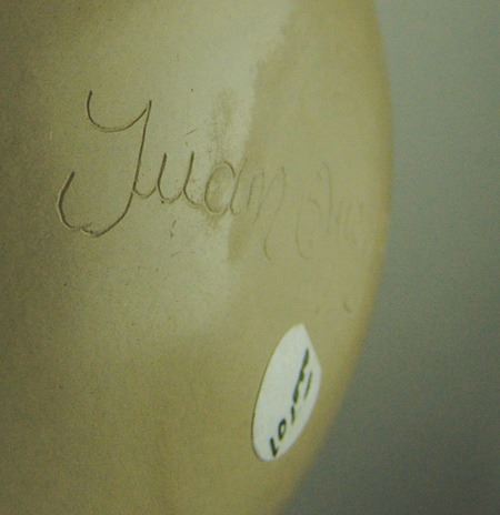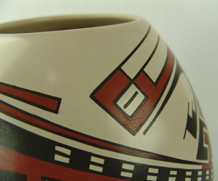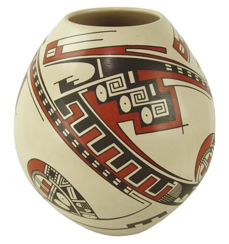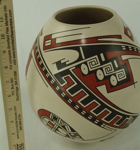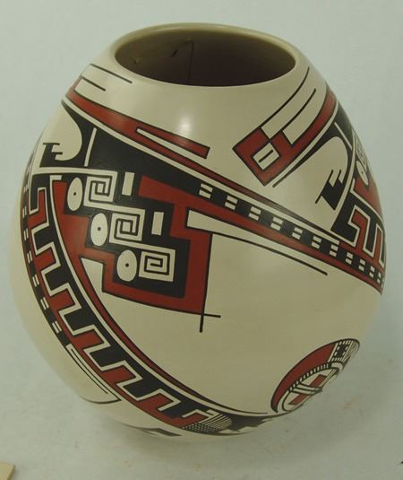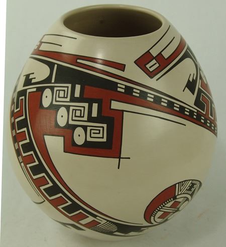 Ca. 1980s, Fantastic early original thin-walled pottery jar with polychrome design by the father of the Mata Ortiz pottery revival, Juan Quezada; from the Irma Bailey collection where it was purchased in the 1980s for $10,000! Very good condition. 10" x 9"