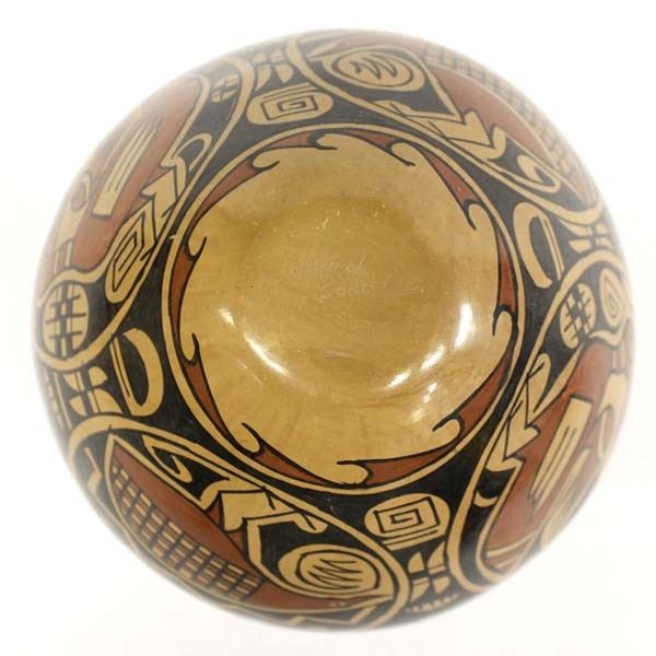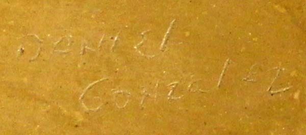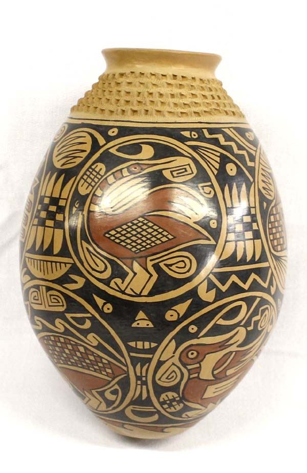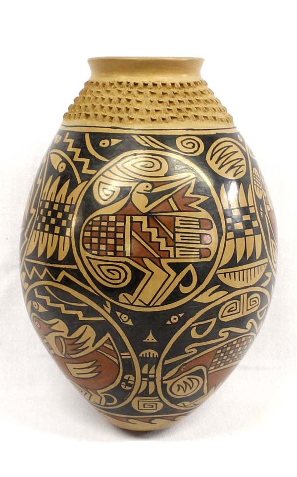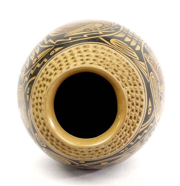 Mata Ortiz Pottery Jar by Daniel Gonzalez, measures 8'' x 10'' and is signed on the bottom, very indicative busy artwork indicative of his work, features bird motif and a textured neck, nice jar