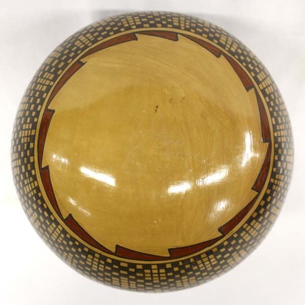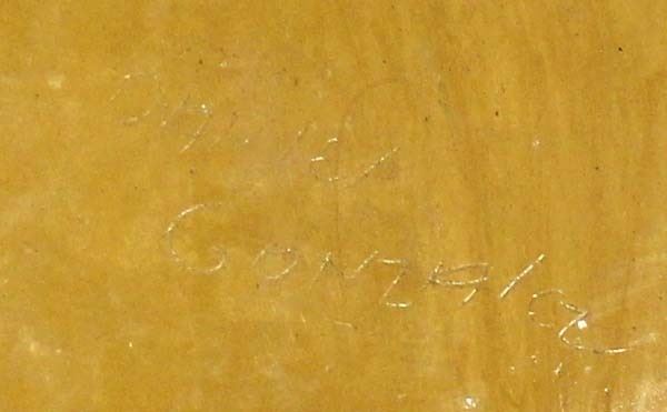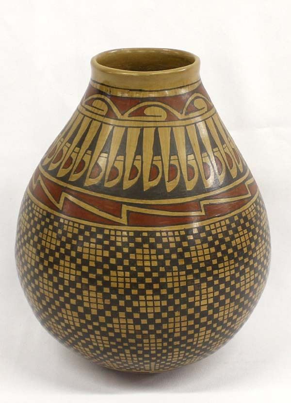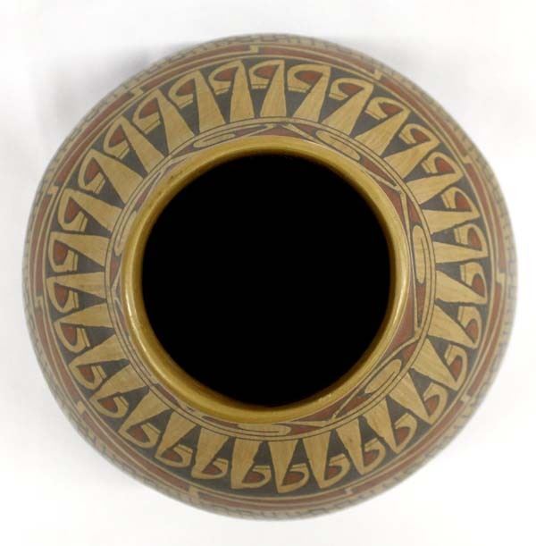 Mata Ortiz Pottery Jar by Daniel Gonzalez (noted potter), measures 8.25'' x 10.25'' and is signed on the bottom, eye dazzler and stylized feather designs