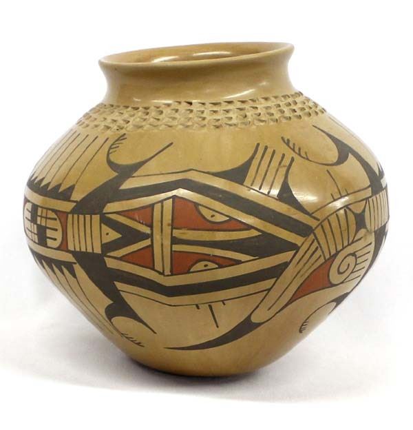 Mata Ortiz Pottery Jar by Jesus Tena, measures 7.25'' x 8'' and is signed on the bottom, textured neck, Paquime' inspired lizard designs