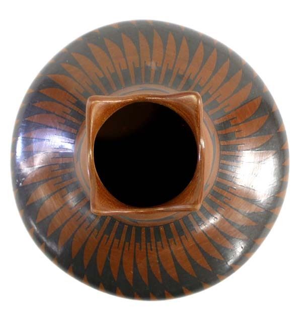 Mata Ortiz Pottery Jar by Julio Ledezma, measures 4.75'' x 4'' and is signed on the bottom, beautiful 4 cornered rim, stylized feather designs