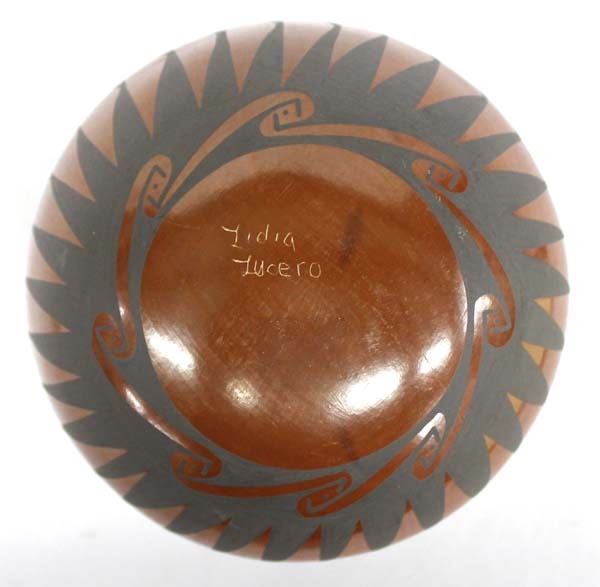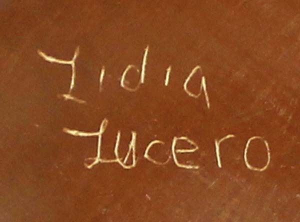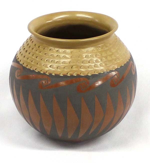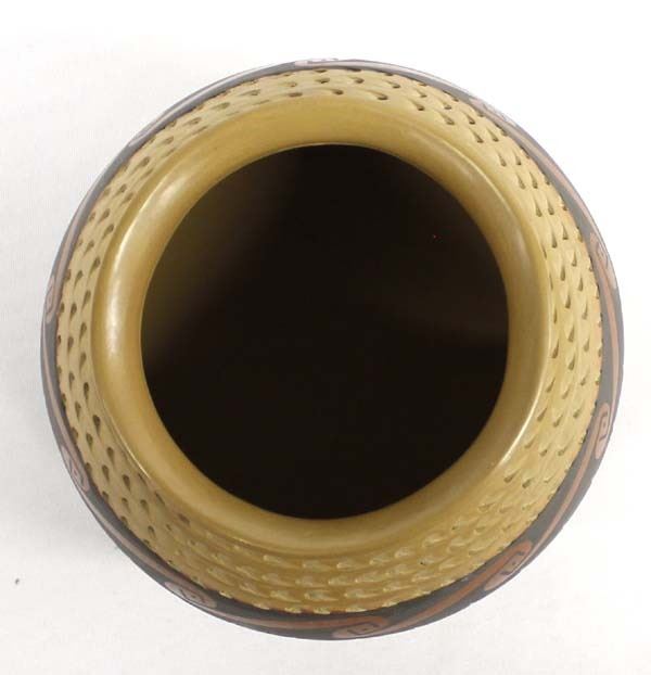 Mata Ortiz Pottery Jar by Lidia Lucero, measures 5'' x 5.5'' and is signed on the bottom, flared rim, highly textured neck, highly burnished in the brown areas