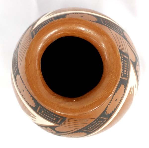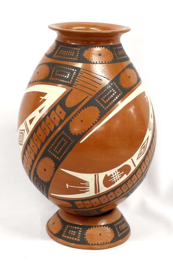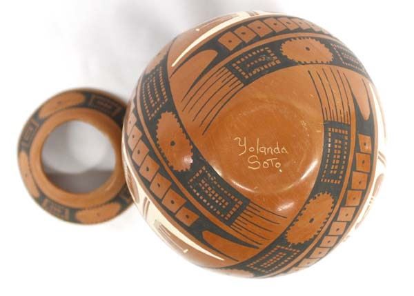 Mata Ortiz Pottery Jar with Matching Pottery Stand by Yolanda Soto, measures 6.5'' x 8.5'' and is signed on the bottom, features Paquime' inspired lines and designs